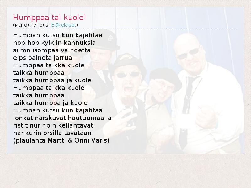 А как ты думаешь, о чем песня "Humppaa tai kuole!" ?