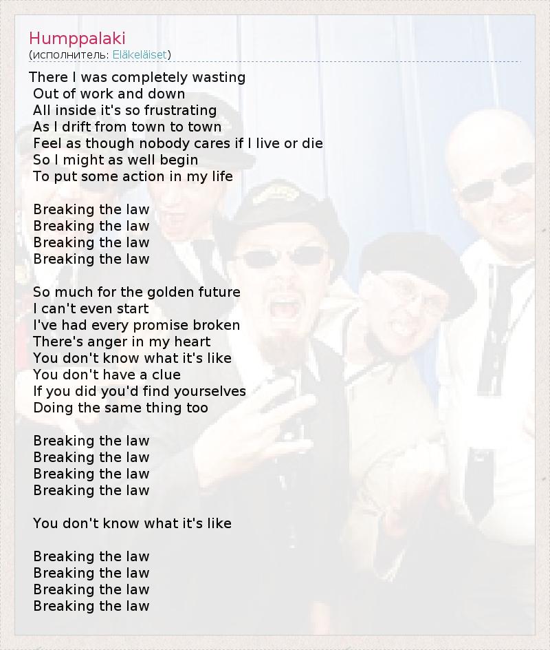 There I was completely wasting Out of work and down All inside it's so frustrating As I drift from town to town Feel as though nobody cares if I live or die So I might as well begin To put some action in my life Breaking the law Breaking the law Breaking the law Breaking the law So much for the golden future I can't even start I've had every promise broken There's anger in my heart You don't know what it's like You don't have a clue If you did you'd find yourselves Doing the same thing too Breaking the law Breaking the law Breaking the law Breaking the law You don't know what it's like Breaking the law Breaking the law Breaking the law Breaking the law