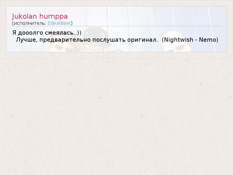 Это интересно:Eläkeläiset (фин. «Пенсионеры») — финский ансамбль, играющий музыку в стиле хумппа (финская разновидность быстрого фокстрота), преимущественно кавер-версии известных рок- и поп-хитов. Образовался в 1993 году. На протяжении существования ансамбля его состав претерпевал некоторые изменения, но наиболее постоянными участниками являются Онни Варис (клавишные, вокал), Матти Варис (бас-гитара,... продолжение