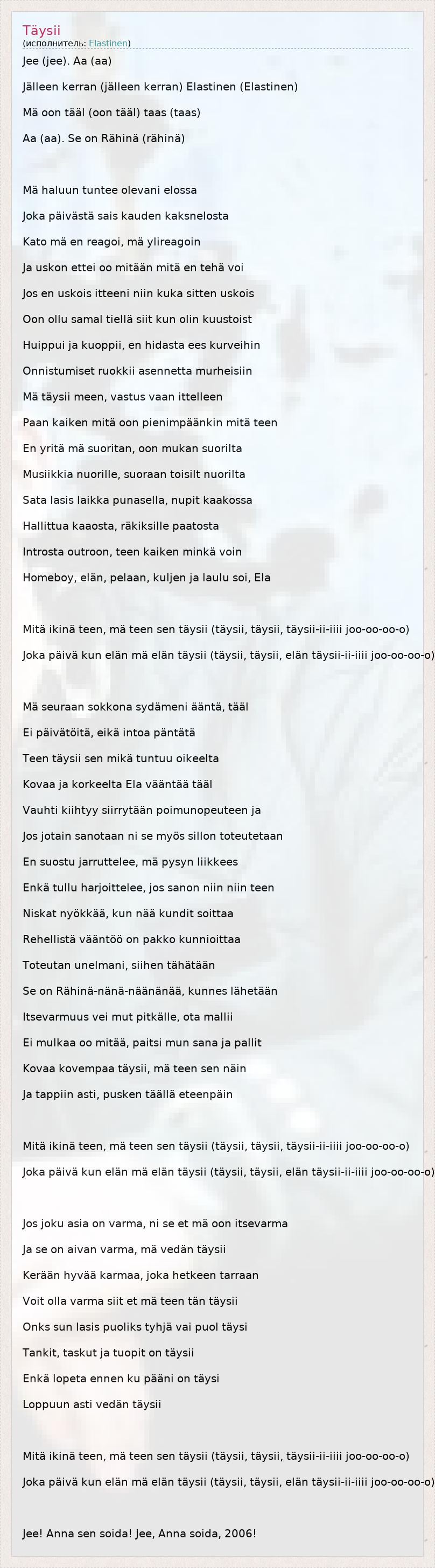 Jee (jee). Aa (aa) Jälleen kerran (jälleen kerran) Elastinen (Elastinen) Mä oon tääl (oon tääl) taas (taas) Aa (aa). Se on Rähinä (rähinä) Mä haluun tuntee olevani elossa Joka päivästä sais kauden kaksnelosta Kato mä en reagoi, mä ylireagoin Ja uskon ettei oo mitään mitä en tehä voi Jos en uskois itteeni niin kuka sitten uskois Oon ollu samal tiellä siit kun olin kuustoist Huippui ja kuoppii, en hidasta ees kurveihin Onnistumiset ruokkii asennetta murheisiin Mä täysii meen, vastus vaan ittelleen Paan kaiken mitä oon pienimpäänkin mitä teen En yritä mä suoritan, oon mukan suorilta Musiikkia nuorille, suoraan toisilt nuorilta Sata lasis laikka punasella, nupit kaakossa Hallittua kaaosta, räkiksille paatosta Introsta outroon, teen kaiken minkä voin Homeboy, elän, pelaan, kuljen ja laulu soi, Ela Mitä ikinä teen, mä teen sen täysii (täysii, täysii, täysii-ii-iiii joo-oo-oo-o) Joka päivä kun elän mä elän täysii (täysii, täysii, elän täysii-ii-iiii joo-oo-oo-o) Mä seuraan sokkona sydämeni ääntä, tääl Ei päivätöitä, eikä intoa päntätä Teen täysii sen mikä tuntuu oikeelta Kovaa ja korkeelta Ela vääntää tääl Vauhti kiihtyy siirrytään poimunopeuteen ja Jos jotain sanotaan ni se myös sillon toteutetaan En suostu jarruttelee, mä pysyn liikkees Enkä tullu harjoittelee, jos sanon niin niin teen Niskat nyökkää, kun nää kundit soittaa Rehellistä vääntöö on pakko kunnioittaa Toteutan unelmani, siihen tähätään Se on Rähinä-nänä-näänänää, kunnes lähetään Itsevarmuus vei mut pitkälle, ota mallii Ei mulkaa oo mitää, paitsi mun sana ja pallit Kovaa kovempaa täysii, mä teen sen näin Ja tappiin asti, pusken täällä eteenpäin Mitä ikinä teen, mä teen sen täysii (täysii, täysii, täysii-ii-iiii joo-oo-oo-o) Joka päivä kun elän mä elän täysii (täysii, täysii, elän täysii-ii-iiii joo-oo-oo-o) Jos joku asia on varma, ni se et mä oon itsevarma Ja se on aivan varma, mä vedän täysii Kerään hyvää karmaa, joka hetkeen tarraan Voit olla varma siit et mä teen tän täysii Onks sun lasis puoliks tyhjä vai puol täysi Tankit, taskut ja tuopit on täysii Enkä lopeta ennen ku pääni on täysi Loppuun asti vedän täysii Mitä ikinä teen, mä teen sen täysii (täysii, täysii, täysii-ii-iiii joo-oo-oo-o) Joka päivä kun elän mä elän täysii (täysii, täysii, elän täysii-ii-iiii joo-oo-oo-o) Jee! Anna sen soida! Jee, Anna soida, 2006!