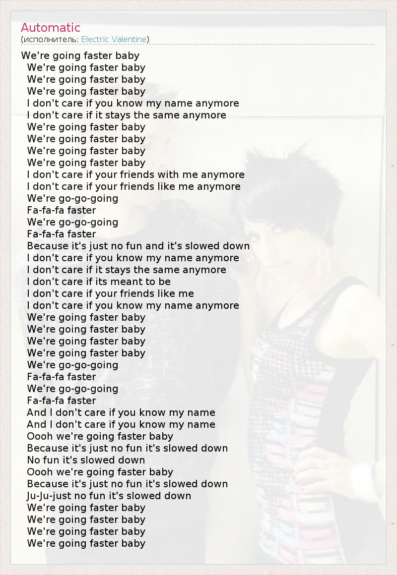 We're going faster baby We're going faster baby We're going faster baby We're going faster baby I don't care if you know my name anymore I don't care if it stays the same anymore We're going faster baby We're going faster baby We're going faster baby We're going faster baby I don't care if your friends with me anymore I don't care if your friends like me anymore We're go-go-going Fa-fa-fa faster We're go-go-going Fa-fa-fa faster Because it's just no fun and it's slowed down I don't care if you know my name anymore I don't care if it stays the same anymore I don't care if its meant to be I don't care if your friends like me I don't care if you know my name anymore We're going faster baby We're going faster baby We're going faster baby We're going faster baby We're go-go-going Fa-fa-fa faster We're go-go-going Fa-fa-fa faster And I don't care if you know my name And I don't care if you know my name Oooh we're going faster baby Because it's just no fun it's slowed down No fun it's slowed down Oooh we're going faster baby Because it's just no fun it's slowed down Ju-Ju-just no fun it's slowed down We're going faster baby We're going faster baby We're going faster baby We're going faster baby