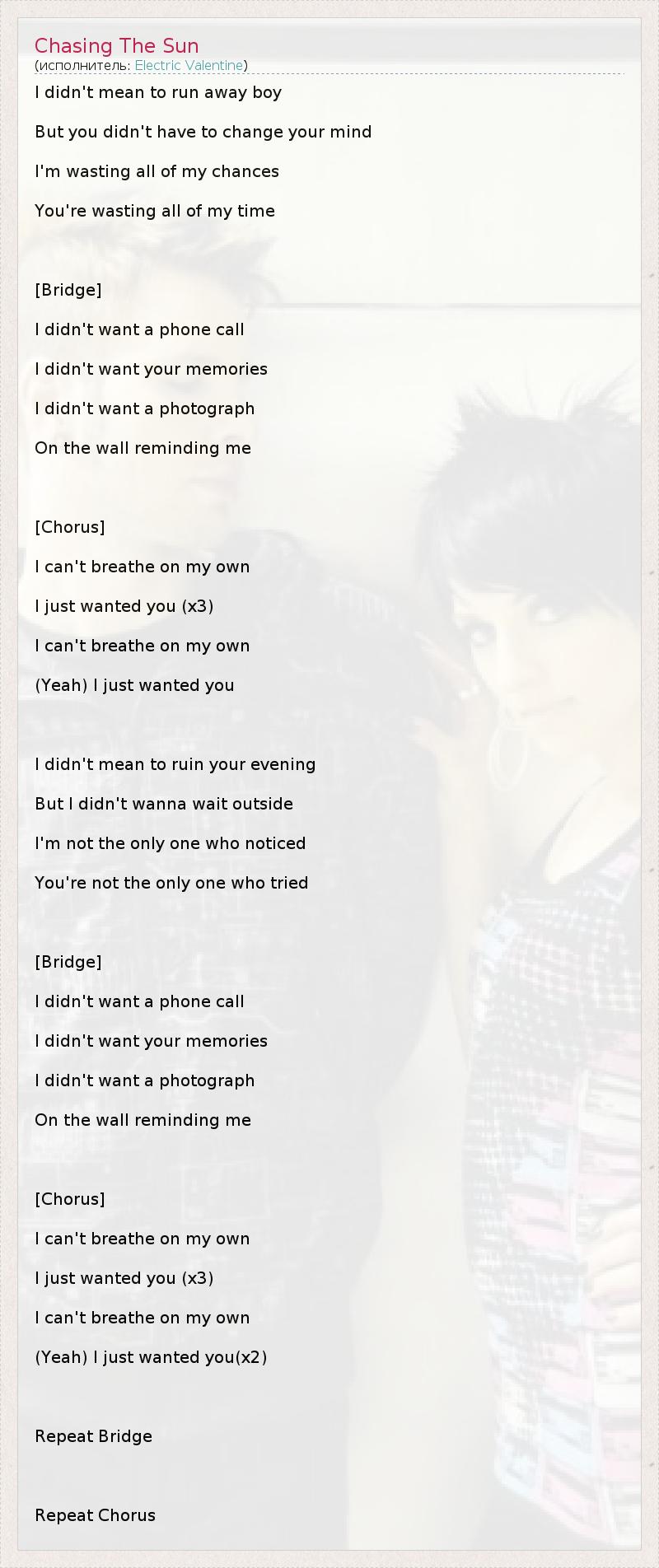 I didn't mean to run away boy But you didn't have to change your mind I'm wasting all of my chances You're wasting all of my time [Bridge] I didn't want a phone call I didn't want your memories I didn't want a photograph On the wall reminding me [Chorus] I can't breathe on my own I just wanted you (x3) I can't breathe on my own (Yeah) I just wanted you I didn't mean to ruin your evening But I didn't wanna wait outside I'm not the only one who noticed You're not the only one who tried [Bridge] I didn't want a phone call I didn't want your memories I didn't want a photograph On the wall reminding me [Chorus] I can't breathe on my own I just wanted you (x3) I can't breathe on my own (Yeah) I just wanted you(x2) Repeat Bridge Repeat Chorus