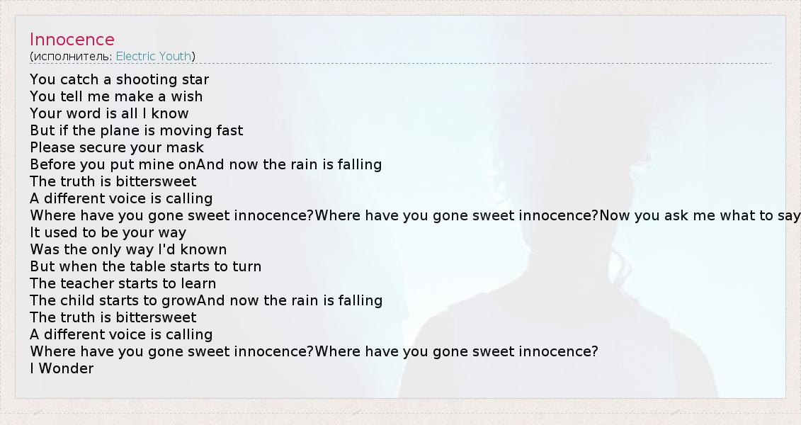 Where have you gone sweet innocence?Where have you gone sweet innocence?Now you ask me what to say