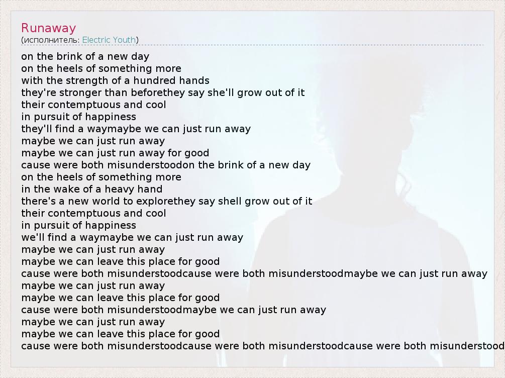 on the brink of a new day on the heels of something more with the strength of a hundred hands they're stronger than beforethey say she'll grow out of it their contemptuous and cool in pursuit of happiness they'll find a waymaybe we can just run away maybe we can just run away maybe we can just run away for good cause were both misunderstoodon the brink of a new day on the heels of something more in the wake of a heavy hand there's a new world to explorethey say shell grow out of it their contemptuous and cool in pursuit of happiness we'll find a waymaybe we can just run away maybe we can just run away maybe we can leave this place for good cause were both misunderstoodcause were both misunderstoodmaybe we can just run away maybe we can just run away maybe we can leave this place for good cause were both misunderstoodmaybe we can just run away maybe we can just run away maybe we can leave this place for good cause were both misunderstoodcause were both misunderstoodcause were both misunderstood