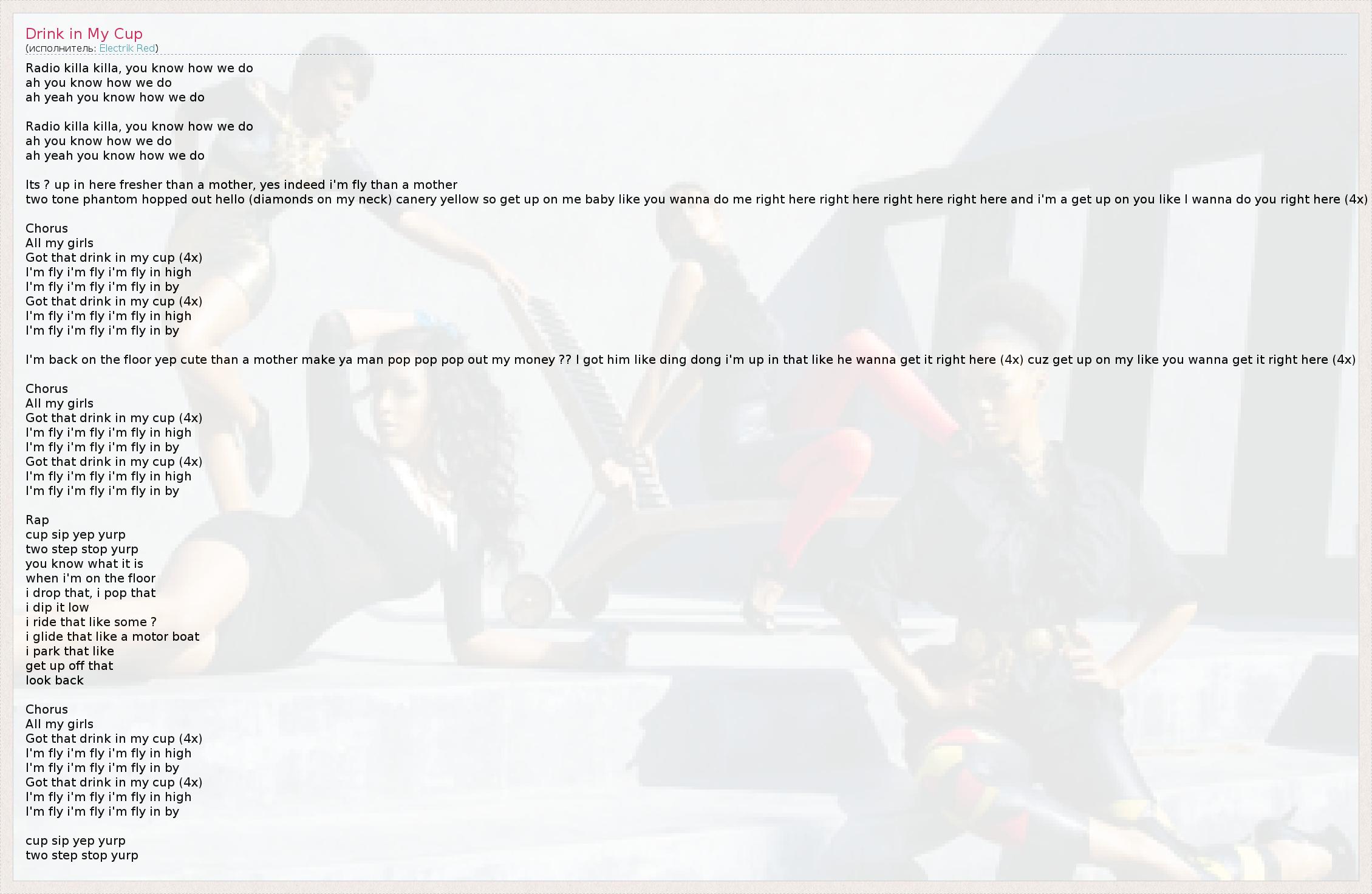 Radio killa killa, you know how we do ah you know how we do ah yeah you know how we do Radio killa killa, you know how we do ah you know how we do ah yeah you know how we do Its ? up in here fresher than a mother, yes indeed i'm fly than a mother two tone phantom hopped out hello (diamonds on my neck) canery yellow so get up on me baby like you wanna do me right here right here right here right here and i'm a get up on you like I wanna do you right here (4x) Chorus All my girls Got that drink in my cup (4x) I'm fly i'm fly i'm fly in high I'm fly i'm fly i'm fly in by Got that drink in my cup (4x) I'm fly i'm fly i'm fly in high I'm fly i'm fly i'm fly in by I'm back on the floor yep cute than a mother make ya man pop pop pop out my money ?? I got him like ding dong i'm up in that like he wanna get it right here (4x) cuz get up on my like you wanna get it right here (4x) Chorus All my girls Got that drink in my cup (4x) I'm fly i'm fly i'm fly in high I'm fly i'm fly i'm fly in by Got that drink in my cup (4x) I'm fly i'm fly i'm fly in high I'm fly i'm fly i'm fly in by Rap cup sip yep yurp two step stop yurp you know what it is when i'm on the floor i drop that, i pop that i dip it low i ride that like some ? i glide that like a motor boat i park that like get up off that look back Chorus All my girls Got that drink in my cup (4x) I'm fly i'm fly i'm fly in high I'm fly i'm fly i'm fly in by Got that drink in my cup (4x) I'm fly i'm fly i'm fly in high I'm fly i'm fly i'm fly in by cup sip yep yurp two step stop yurp