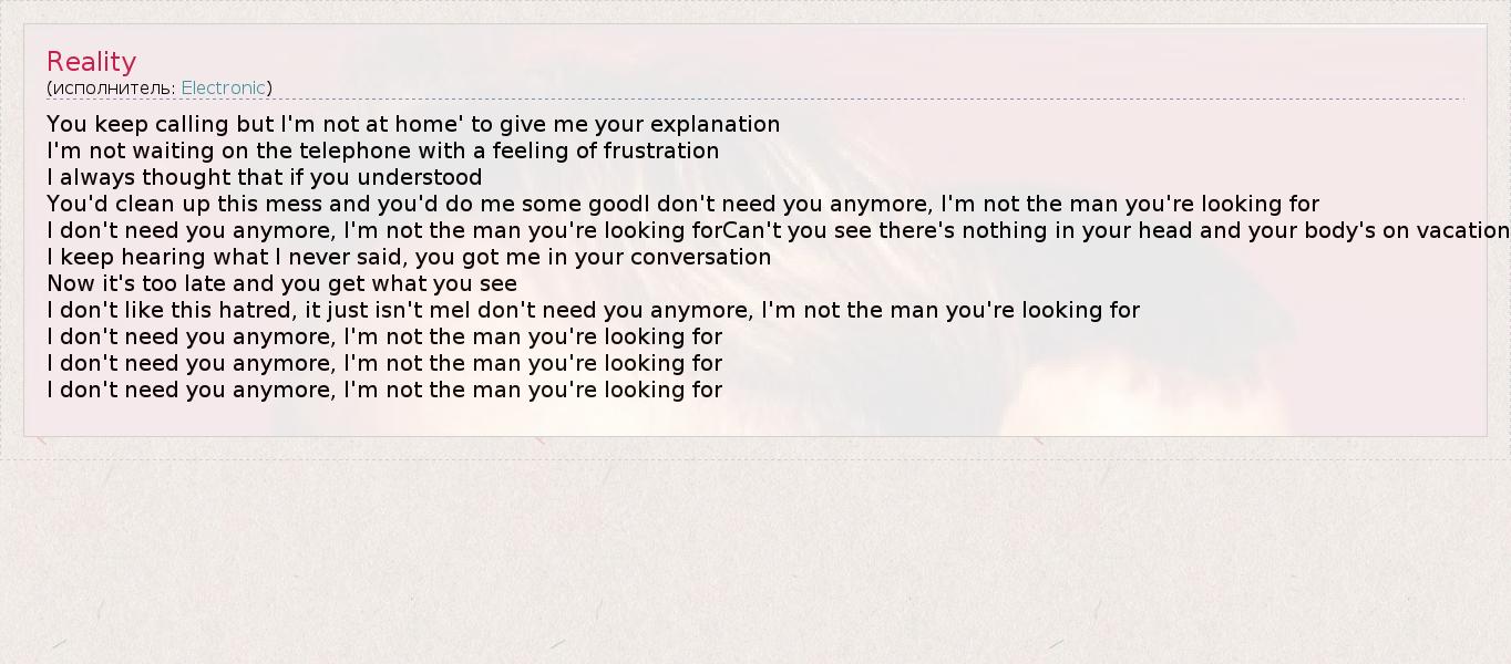You keep calling but I'm not at home' to give me your explanation I'm not waiting on the telephone with a feeling of frustration I always thought that if you understood You'd clean up this mess and you'd do me some goodI don't need you anymore, I'm not the man you're looking for I don't need you anymore, I'm not the man you're looking forCan't you see there's nothing in your head and your body's on vacation I keep hearing what I never said, you got me in your conversation Now it's too late and you get what you see I don't like this hatred, it just isn't meI don't need you anymore, I'm not the man you're looking for I don't need you anymore, I'm not the man you're looking for I don't need you anymore, I'm not the man you're looking for I don't need you anymore, I'm not the man you're looking for