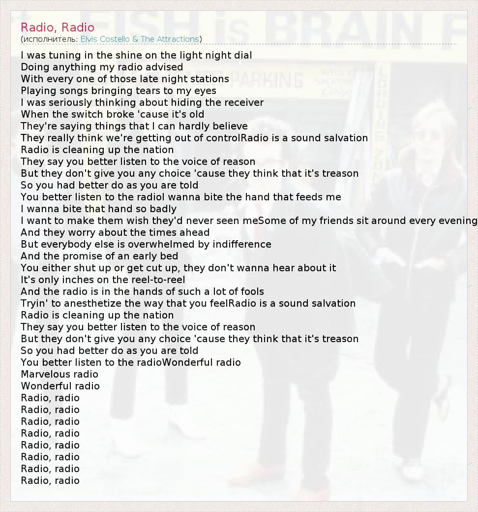 I was tuning in the shine on the light night dial Doing anything my radio advised With every one of those late night stations Playing songs bringing tears to my eyes I was seriously thinking about hiding the receiver When the switch broke 'cause it's old They're saying things that I can hardly believe They really think we're getting out of controlRadio is a sound salvation Radio is cleaning up the nation They say you better listen to the voice of reason But they don't give you any choice 'cause they think that it's treason So you had better do as you are told You better listen to the radioI wanna bite the hand that feeds me I wanna bite that hand so badly I want to make them wish they'd never seen meSome of my friends sit around every evening And they worry about the times ahead But everybody else is overwhelmed by indifference And the promise of an early bed You either shut up or get cut up, they don't wanna hear about it It's only inches on the reel-to-reel And the radio is in the hands of such a lot of fools Tryin' to anesthetize the way that you feelRadio is a sound salvation Radio is cleaning up the nation They say you better listen to the voice of reason But they don't give you any choice 'cause they think that it's treason So you had better do as you are told You better listen to the radioWonderful radio Marvelous radio Wonderful radio Radio, radio Radio, radio Radio, radio Radio, radio Radio, radio Radio, radio Radio, radio Radio, radio