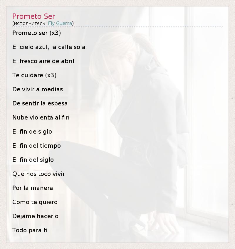 Prometo ser (x3) El cielo azul, la calle sola El fresco aire de abril Te cuidare (x3) De vivir a medias De sentir la espesa Nube violenta al fin El fin de siglo El fin del tiempo El fin del siglo Que nos toco vivir Por la manera Como te quiero Dejame hacerlo Todo para ti