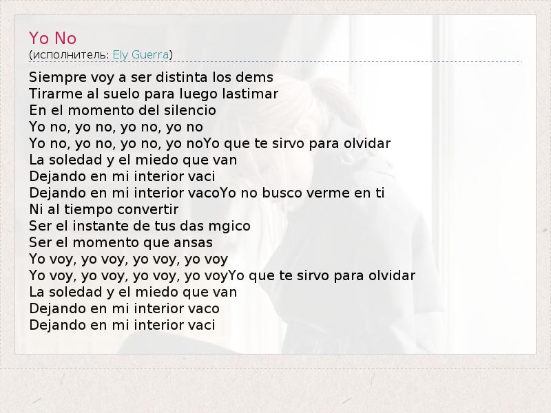 Siempre voy a ser distinta los dems Tirarme al suelo para luego lastimar En el momento del silencio Yo no, yo no, yo no, yo no Yo no, yo no, yo no, yo noYo que te sirvo para olvidar La soledad y el miedo que van Dejando en mi interior vaci Dejando en mi interior vacoYo no busco verme en ti Ni al tiempo convertir Ser el instante de tus das mgico Ser el momento que ansas Yo voy, yo voy, yo voy, yo voy Yo voy, yo voy, yo voy, yo voyYo que te sirvo para olvidar La soledad y el miedo que van Dejando en mi interior vaco Dejando en mi interior vaci