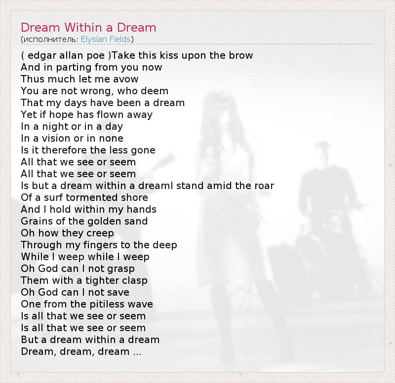 ( edgar allan poe )Take this kiss upon the brow And in parting from you now Thus much let me avow You are not wrong, who deem That my days have been a dream Yet if hope has flown away In a night or in a day In a vision or in none Is it therefore the less gone All that we see or seem All that we see or seem Is but a dream within a dreamI stand amid the roar Of a surf tormented shore And I hold within my hands Grains of the golden sand Oh how they creep Through my fingers to the deep While I weep while I weep Oh God can I not grasp Them with a tighter clasp Oh God can I not save One from the pitiless wave Is all that we see or seem Is all that we see or seem But a dream within a dream Dream, dream, dream ...