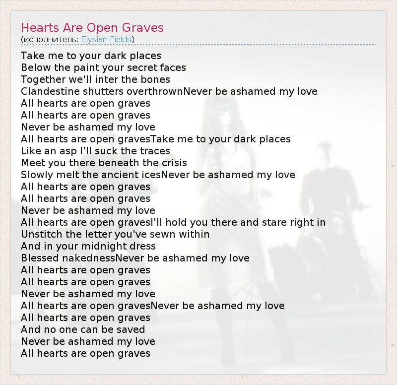 Take me to your dark places Below the paint your secret faces Together we'll inter the bones Clandestine shutters overthrownNever be ashamed my love All hearts are open graves All hearts are open graves Never be ashamed my love All hearts are open gravesTake me to your dark places Like an asp I'll suck the traces Meet you there beneath the crisis Slowly melt the ancient icesNever be ashamed my love All hearts are open graves All hearts are open graves Never be ashamed my love All hearts are open gravesI'll hold you there and stare right in Unstitch the letter you've sewn within And in your midnight dress Blessed nakednessNever be ashamed my love All hearts are open graves All hearts are open graves Never be ashamed my love All hearts are open gravesNever be ashamed my love All hearts are open graves And no one can be saved Never be ashamed my love All hearts are open graves