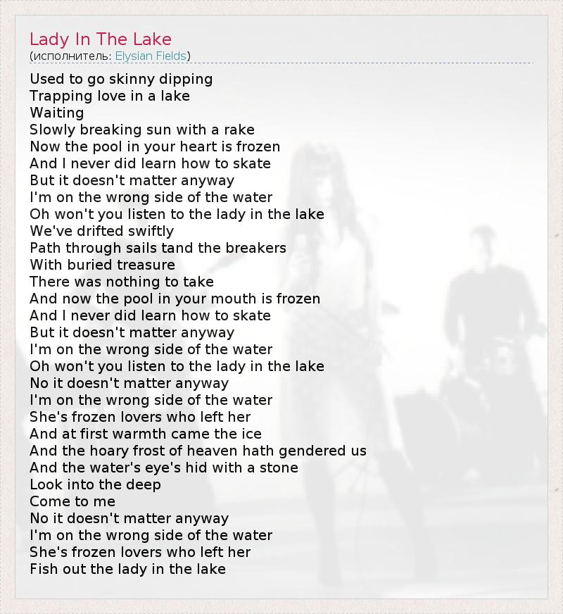 Used to go skinny dipping Trapping love in a lake Waiting Slowly breaking sun with a rake Now the pool in your heart is frozen And I never did learn how to skate But it doesn't matter anyway I'm on the wrong side of the water Oh won't you listen to the lady in the lake We've drifted swiftly Path through sails tand the breakers With buried treasure There was nothing to take And now the pool in your mouth is frozen And I never did learn how to skate But it doesn't matter anyway I'm on the wrong side of the water Oh won't you listen to the lady in the lake No it doesn't matter anyway I'm on the wrong side of the water She's frozen lovers who left her And at first warmth came the ice And the hoary frost of heaven hath gendered us And the water's eye's hid with a stone Look into the deep Come to me No it doesn't matter anyway I'm on the wrong side of the water She's frozen lovers who left her Fish out the lady in the lake