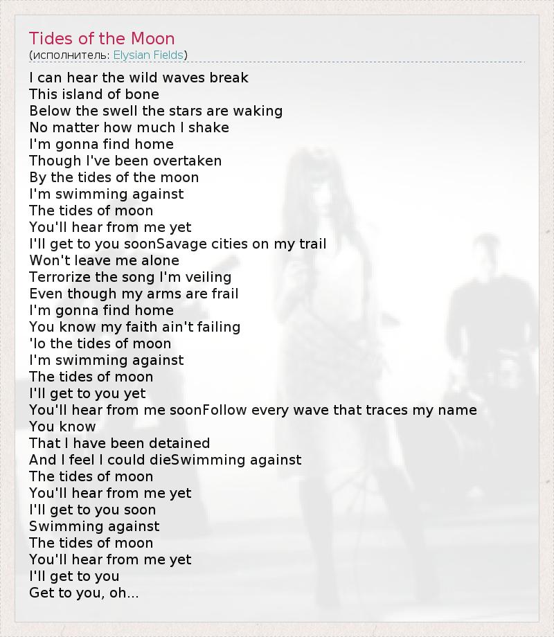 I can hear the wild waves break This island of bone Below the swell the stars are waking No matter how much I shake I'm gonna find home Though I've been overtaken By the tides of the moon I'm swimming against The tides of moon You'll hear from me yet I'll get to you soonSavage cities on my trail Won't leave me alone Terrorize the song I'm veiling Even though my arms are frail I'm gonna find home You know my faith ain't failing 'lo the tides of moon I'm swimming against The tides of moon I'll get to you yet You'll hear from me soonFollow every wave that traces my name You know That I have been detained And I feel I could dieSwimming against The tides of moon You'll hear from me yet I'll get to you soon Swimming against The tides of moon You'll hear from me yet I'll get to you Get to you, oh...