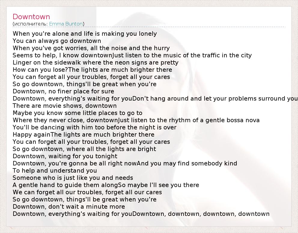 Downtown, you're gonna be all right nowAnd you may find somebody kind