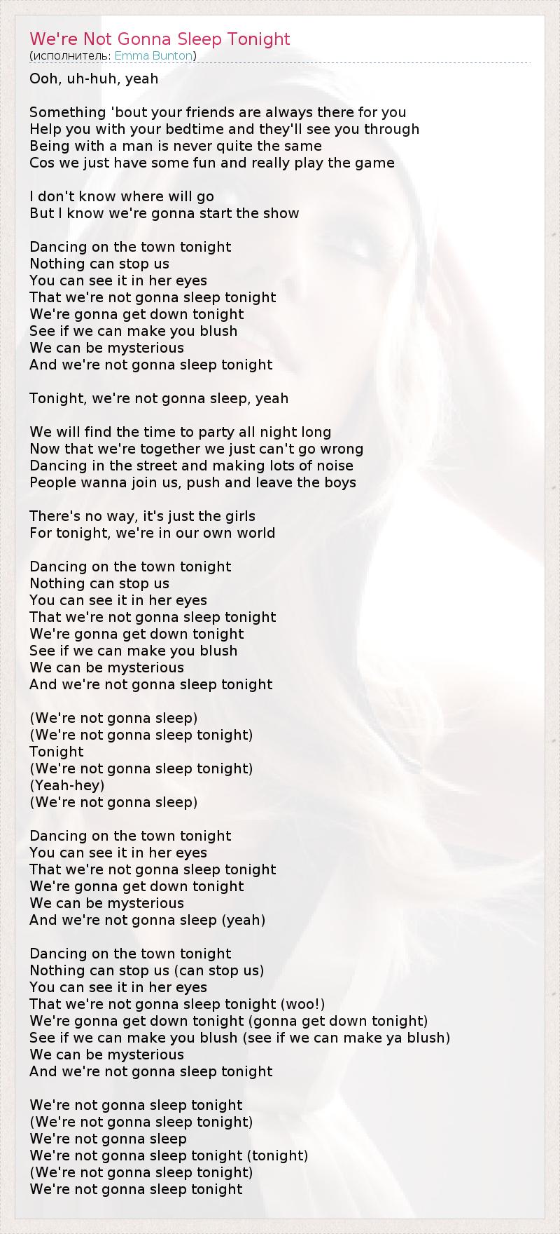 Ooh, uh-huh, yeah Something 'bout your friends are always there for you Help you with your bedtime and they'll see you through Being with a man is never quite the same Cos we just have some fun and really play the game I don't know where will go But I know we're gonna start the show Dancing on the town tonight Nothing can stop us You can see it in her eyes That we're not gonna sleep tonight We're gonna get down tonight See if we can make you blush We can be mysterious And we're not gonna sleep tonight Tonight, we're not gonna sleep, yeah We will find the time to party all night long Now that we're together we just can't go wrong Dancing in the street and making lots of noise People wanna join us, push and leave the boys There's no way, it's just the girls For tonight, we're in our own world Dancing on the town tonight Nothing can stop us You can see it in her eyes That we're not gonna sleep tonight We're gonna get down tonight See if we can make you blush We can be mysterious And we're not gonna sleep tonight (We're not gonna sleep) (We're not gonna sleep tonight) Tonight (We're not gonna sleep tonight) (Yeah-hey) (We're not gonna sleep) Dancing on the town tonight You can see it in her eyes That we're not gonna sleep tonight We're gonna get down tonight We can be mysterious And we're not gonna sleep (yeah) Dancing on the town tonight Nothing can stop us (can stop us) You can see it in her eyes That we're not gonna sleep tonight (woo!) We're gonna get down tonight (gonna get down tonight) See if we can make you blush (see if we can make ya blush) We can be mysterious And we're not gonna sleep tonight We're not gonna sleep tonight (We're not gonna sleep tonight) We're not gonna sleep We're not gonna sleep tonight (tonight) (We're not gonna sleep tonight) We're not gonna sleep tonight