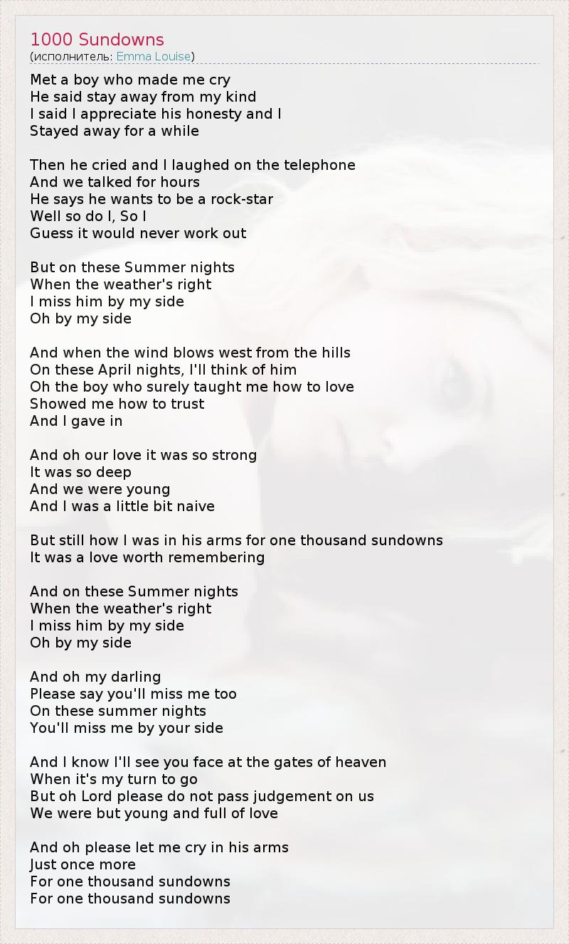 Met a boy who made me cry He said stay away from my kind I said I appreciate his honesty and I Stayed away for a while Then he cried and I laughed on the telephone And we talked for hours He says he wants to be a rock-star Well so do I, So I Guess it would never work out But on these Summer nights When the weather's right I miss him by my side Oh by my side And when the wind blows west from the hills On these April nights, I'll think of him Oh the boy who surely taught me how to love Showed me how to trust And I gave in And oh our love it was so strong It was so deep And we were young And I was a little bit naive But still how I was in his arms for one thousand sundowns It was a love worth remembering And on these Summer nights When the weather's right I miss him by my side Oh by my side And oh my darling Please say you'll miss me too On these summer nights You'll miss me by your side And I know I'll see you face at the gates of heaven When it's my turn to go But oh Lord please do not pass judgement on us We were but young and full of love And oh please let me cry in his arms Just once more For one thousand sundowns For one thousand sundowns