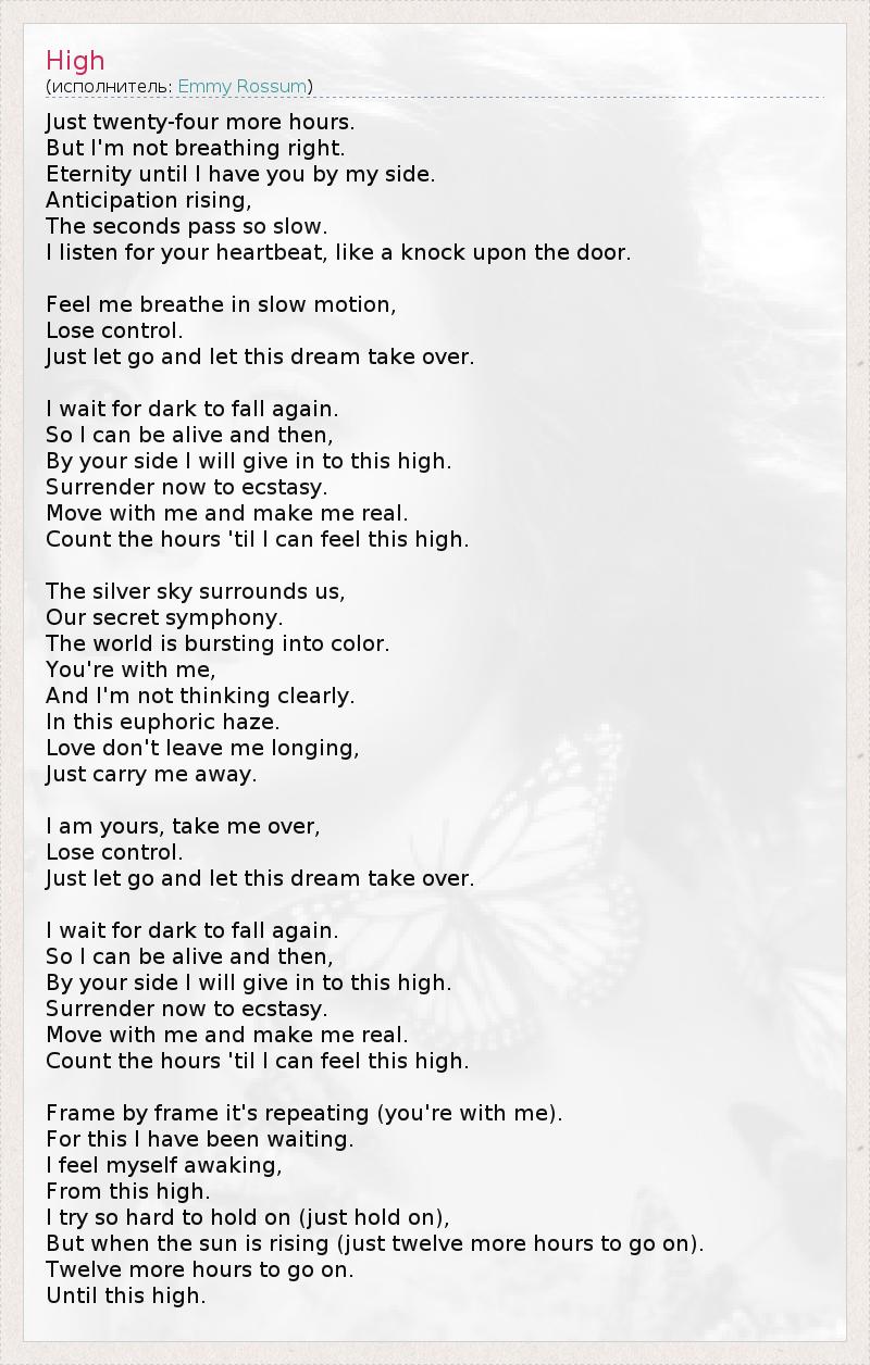 Just twenty-four more hours. But I'm not breathing right. Eternity until I have you by my side. Anticipation rising, The seconds pass so slow. I listen for your heartbeat, like a knock upon the door. Feel me breathe in slow motion, Lose control. Just let go and let this dream take over. I wait for dark to fall again. So I can be alive and then, By your side I will give in to this high. Surrender now to ecstasy. Move with me and make me real. Count the hours 'til I can feel this high. The silver sky surrounds us, Our secret symphony. The world is bursting into color. You're with me, And I'm not thinking clearly. In this euphoric haze. Love don't leave me longing, Just carry me away. I am yours, take me over, Lose control. Just let go and let this dream take over. I wait for dark to fall again. So I can be alive and then, By your side I will give in to this high. Surrender now to ecstasy. Move with me and make me real. Count the hours 'til I can feel this high. Frame by frame it's repeating (you're with me). For this I have been waiting. I feel myself awaking, From this high. I try so hard to hold on (just hold on), But when the sun is rising (just twelve more hours to go on). Twelve more hours to go on. Until this high.
