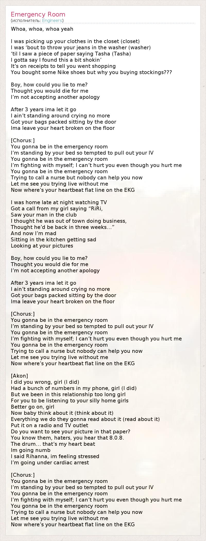 Whoa, whoa, whoa yeah I was picking up your clothes in the closet (closet) I was ‘bout to throw your jeans in the washer (washer) ‘til I saw a piece of paper saying Tasha (Tasha) I gotta say I found this a bit shokin’ It’s on receipts to tell you went shopping You bought some Nike shoes but why you buying stockings??? Boy, how could you lie to me? Thought you would die for me I’m not accepting another apology After 3 years ima let it go I ain’t standing around crying no more Got your bags packed sitting by the door Ima leave your heart broken on the floor [Chorus:] You gonna be in the emergency room I’m standing by your bed so tempted to pull out your IV You gonna be in the emergency room I’m fighting with myself; I can’t hurt you even though you hurt me You gonna be in the emergency room Trying to call a nurse but nobody can help you now Let me see you trying live without me Now where’s your heartbeat flat line on the EKG I was home late at night watching TV Got a call from my girl saying “RiRi, Saw your man in the club I thought he was out of town doing business, Thought he’d be back in three weeks…” And now I’m mad Sitting in the kitchen getting sad Looking at your pictures Boy, how could you lie to me? Thought you would die for me I’m not accepting another apology After 3 years ima let it go I ain’t standing around crying no more Got your bags packed sitting by the door Ima leave your heart broken on the floor [Chorus:] You gonna be in the emergency room I’m standing by your bed so tempted to pull out your IV You gonna be in the emergency room I’m fighting with myself; I can’t hurt you even though you hurt me You gonna be in the emergency room Trying to call a nurse but nobody can help you now Let me see you trying live without me Now where’s your heartbeat flat line on the EKG [Akon] I did you wrong, girl (I did) Had a bunch of numbers in my phone, girl (I did) But we been in this relationship too long girl For you to be listening to your silly home girls Better go on, girl Now baby think about it (think about it) Everything we do they gonna read about it (read about it) Put it on a radio and TV outlet Do you want to see your picture in that paper? You know them, haters, you hear that 8.0.8. The drum… that’s my heart beat Im going numb I said Rihanna, im feeling stressed I’m going under cardiac arrest [Chorus:] You gonna be in the emergency room I’m standing by your bed so tempted to pull out your IV You gonna be in the emergency room I’m fighting with myself; I can’t hurt you even though you hurt me You gonna be in the emergency room Trying to call a nurse but nobody can help you now Let me see you trying live without me Now where’s your heartbeat flat line on the EKG