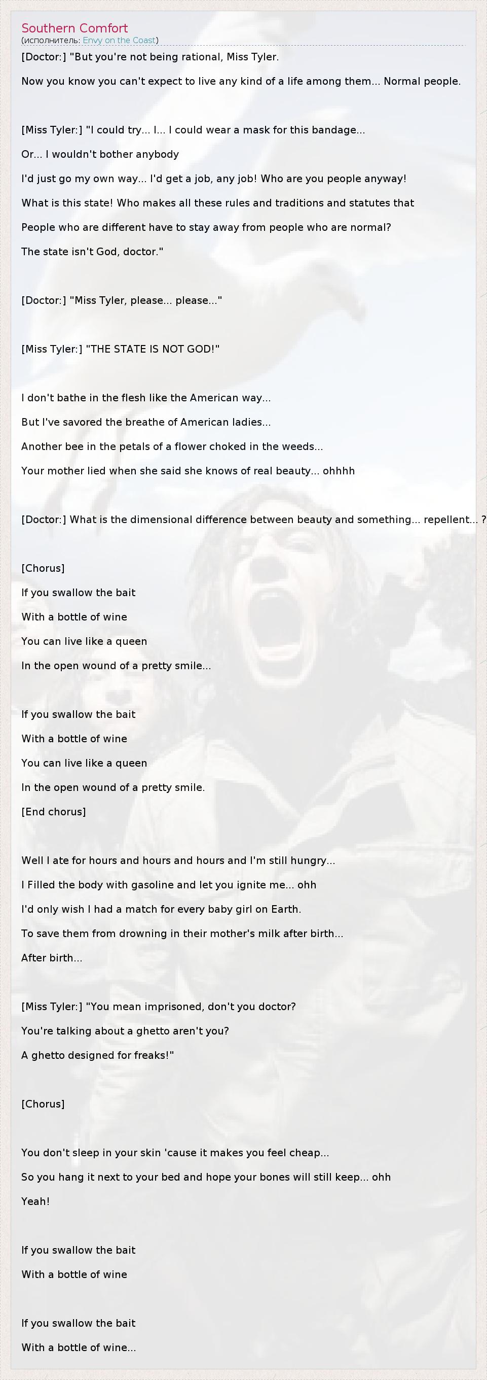 [Doctor:] "But you're not being rational, Miss Tyler. Now you know you can't expect to live any kind of a life among them... Normal people. [Miss Tyler:] "I could try... I... I could wear a mask for this bandage... Or... I wouldn't bother anybody I'd just go my own way... I'd get a job, any job! Who are you people anyway! What is this state! Who makes all these rules and traditions and statutes that People who are different have to stay away from people who are normal? The state isn't God, doctor." [Doctor:] "Miss Tyler, please... please..." [Miss Tyler:] "THE STATE IS NOT GOD!" I don't bathe in the flesh like the American way... But I've savored the breathe of American ladies... Another bee in the petals of a flower choked in the weeds... Your mother lied when she said she knows of real beauty... ohhhh [Doctor:] What is the dimensional difference between beauty and something... repellent... ? [Chorus] If you swallow the bait With a bottle of wine You can live like a queen In the open wound of a pretty smile... If you swallow the bait With a bottle of wine You can live like a queen In the open wound of a pretty smile. [End chorus] Well I ate for hours and hours and hours and I'm still hungry... I Filled the body with gasoline and let you ignite me... ohh I'd only wish I had a match for every baby girl on Earth. To save them from drowning in their mother's milk after birth... After birth... [Miss Tyler:] "You mean imprisoned, don't you doctor? You're talking about a ghetto aren't you? A ghetto designed for freaks!" [Chorus] You don't sleep in your skin 'cause it makes you feel cheap... So you hang it next to your bed and hope your bones will still keep... ohh Yeah! If you swallow the bait With a bottle of wine If you swallow the bait With a bottle of wine...