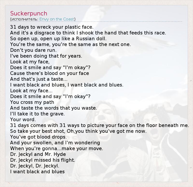 31 days to wreck your plastic face. And it's a disgrace to think I shook the hand that feeds this race. So open up, open up like a Russian doll. You're the same, you're the same as the next one. Don't you dare run. I've been doing that for years. Look at my face, Does it smile and say "I'm okay"? Cause there's blood on your face And that's just a taste... I want black and blues, I want black and blues. Look at my face... Does it smile and say "I'm okay"? You cross my path And taste the words that you waste. I'll take it to the grave. Your word. 31 days comes with 31 ways to picture your face on the floor beneath me. So take your best shot, Oh,you think you've got me now. You've got blood drops. And your swollen, and I'm wondering When you're gonna...make your move. Dr. Jeckyl and Mr. Hyde Dr. Jeckyl missed his flight. Dr. Jeckyl, Dr. Jeckyl. I want black and blues