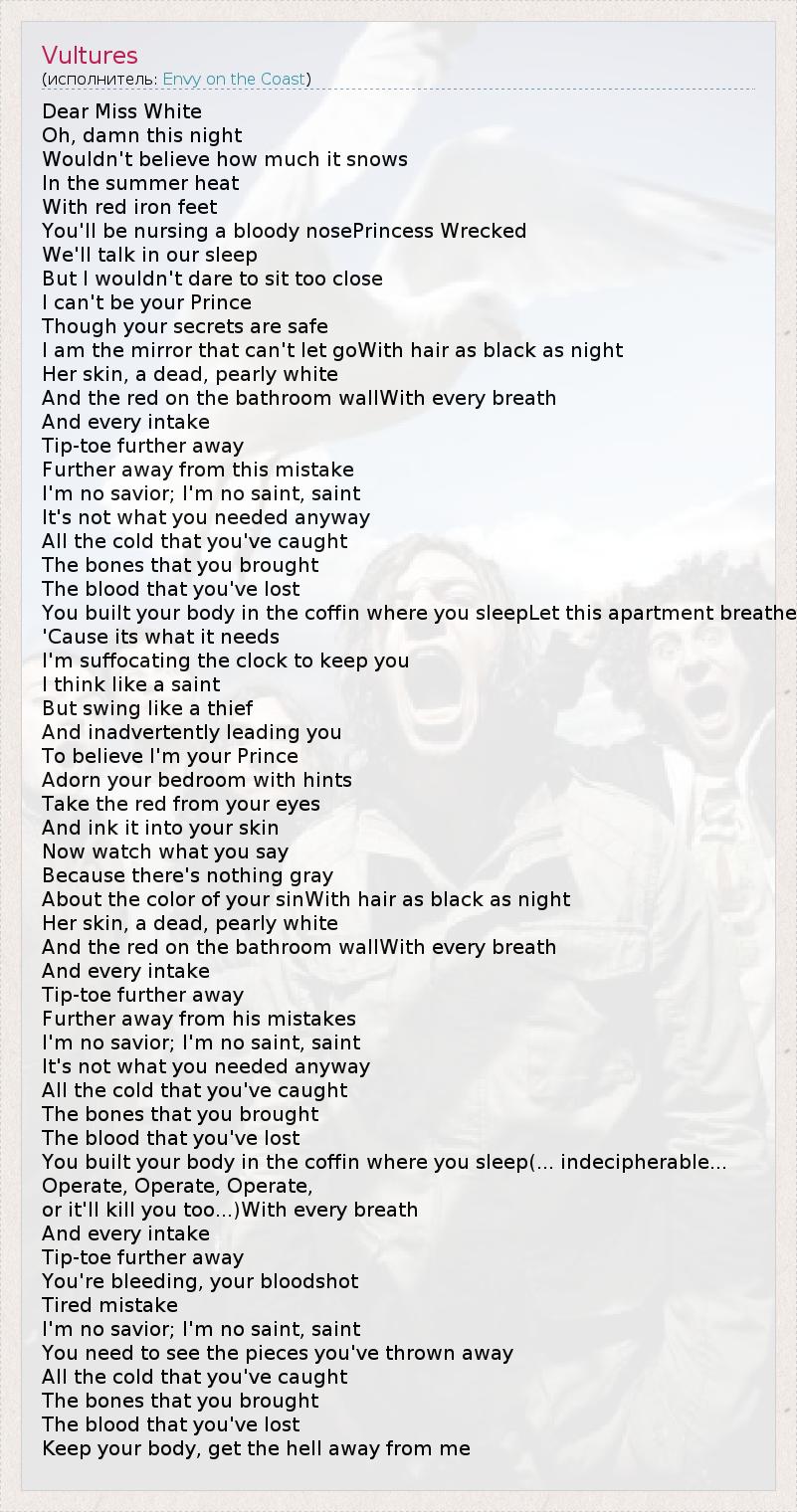 Dear Miss White Oh, damn this night Wouldn't believe how much it snows In the summer heat With red iron feet You'll be nursing a bloody nosePrincess Wrecked We'll talk in our sleep But I wouldn't dare to sit too close I can't be your Prince Though your secrets are safe I am the mirror that can't let goWith hair as black as night Her skin, a dead, pearly white And the red on the bathroom wallWith every breath And every intake Tip-toe further away Further away from this mistake I'm no savior; I'm no saint, saint It's not what you needed anyway All the cold that you've caught The bones that you brought The blood that you've lost You built your body in the coffin where you sleepLet this apartment breathe 'Cause its what it needs I'm suffocating the clock to keep you I think like a saint But swing like a thief And inadvertently leading you To believe I'm your Prince Adorn your bedroom with hints Take the red from your eyes And ink it into your skin Now watch what you say Because there's nothing gray About the color of your sinWith hair as black as night Her skin, a dead, pearly white And the red on the bathroom wallWith every breath And every intake Tip-toe further away Further away from his mistakes I'm no savior; I'm no saint, saint It's not what you needed anyway All the cold that you've caught The bones that you brought The blood that you've lost You built your body in the coffin where you sleep(... indecipherable... Operate, Operate, Operate, or it'll kill you too...)With every breath And every intake Tip-toe further away You're bleeding, your bloodshot Tired mistake I'm no savior; I'm no saint, saint You need to see the pieces you've thrown away All the cold that you've caught The bones that you brought The blood that you've lost Keep your body, get the hell away from me