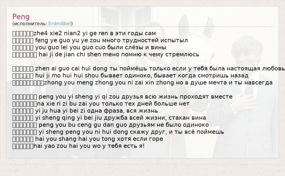 这些年一个人zhe4 xie2 nian2 yi ge ren в эти годы сам 风也过雨也走 feng ye guo yu ye zou много трудностей испытыл 有过泪有过错 you guo lei you guo cuo были слёзы и вины 还记得坚持什么 hai ji de jian chi shen meно помню к чему стремлюсь 真爱过才会懂 zhen ai guo cai hui dong ты поймёшь только если у тебя была настоящая любовь 会寂寞会回首 hui ji mo hui hui shou бывает одиноко, бывает когда смотришь назад 终有梦终有你在心中zhong you meng zhong you ni zai xin zhong но в душе мечта и ты навсегда 朋友一生一起走 peng you yi sheng yi qi zou друзья всю жизнь проходят вместе 那些日子不再有na xie ri zi bu zai you только тех дней больше нет 一句话一辈子 yi ju hua yi bei zi одна фраза, вся жизнь 一生情一杯酒 yi sheng qing yi bei jiu дружба всей жизни, стакан вина 朋友不曾孤单过 peng you bu ceng gu dan guo друзьям не было одиноко 一声朋友你会懂 yi sheng peng you ni hui dong скажу друг, и ты всё поймешь 还有伤还有痛 hai you shang hai you tong хотя если горе 还要走还有我hai yao zou hai you wo у тебя есть я!