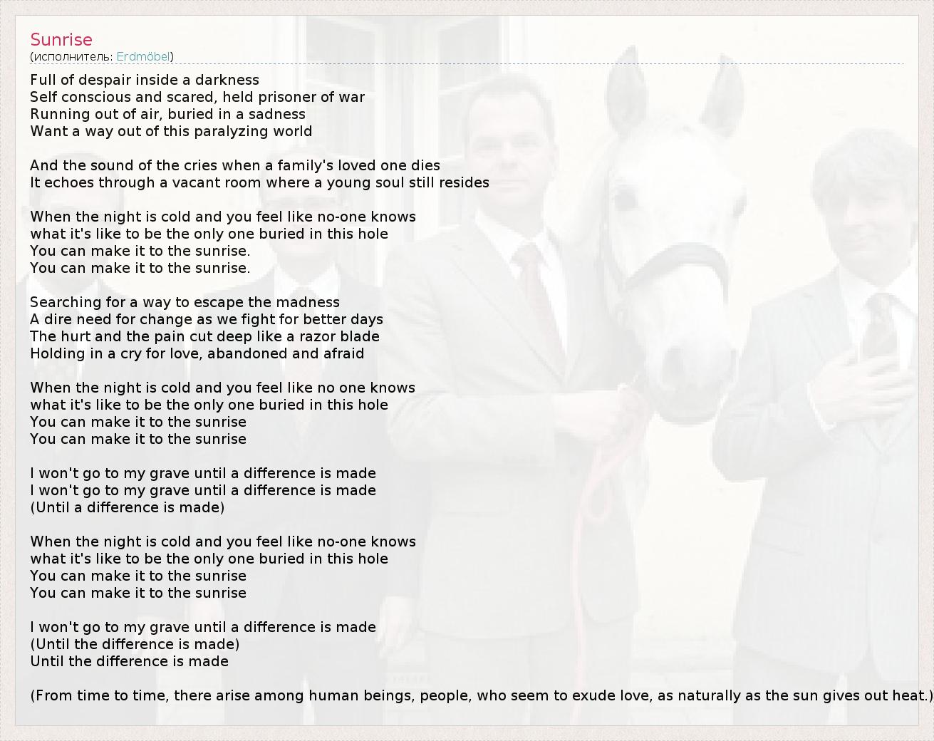 Full of despair inside a darkness Self conscious and scared, held prisoner of war Running out of air, buried in a sadness Want a way out of this paralyzing world And the sound of the cries when a family's loved one dies It echoes through a vacant room where a young soul still resides When the night is cold and you feel like no-one knows what it's like to be the only one buried in this hole You can make it to the sunrise. You can make it to the sunrise. Searching for a way to escape the madness A dire need for change as we fight for better days The hurt and the pain cut deep like a razor blade Holding in a cry for love, abandoned and afraid When the night is cold and you feel like no one knows what it's like to be the only one buried in this hole You can make it to the sunrise You can make it to the sunrise I won't go to my grave until a difference is made I won't go to my grave until a difference is made (Until a difference is made) When the night is cold and you feel like no-one knows what it's like to be the only one buried in this hole You can make it to the sunrise You can make it to the sunrise I won't go to my grave until a difference is made (Until the difference is made) Until the difference is made (From time to time, there arise among human beings, people, who seem to exude love, as naturally as the sun gives out heat.)