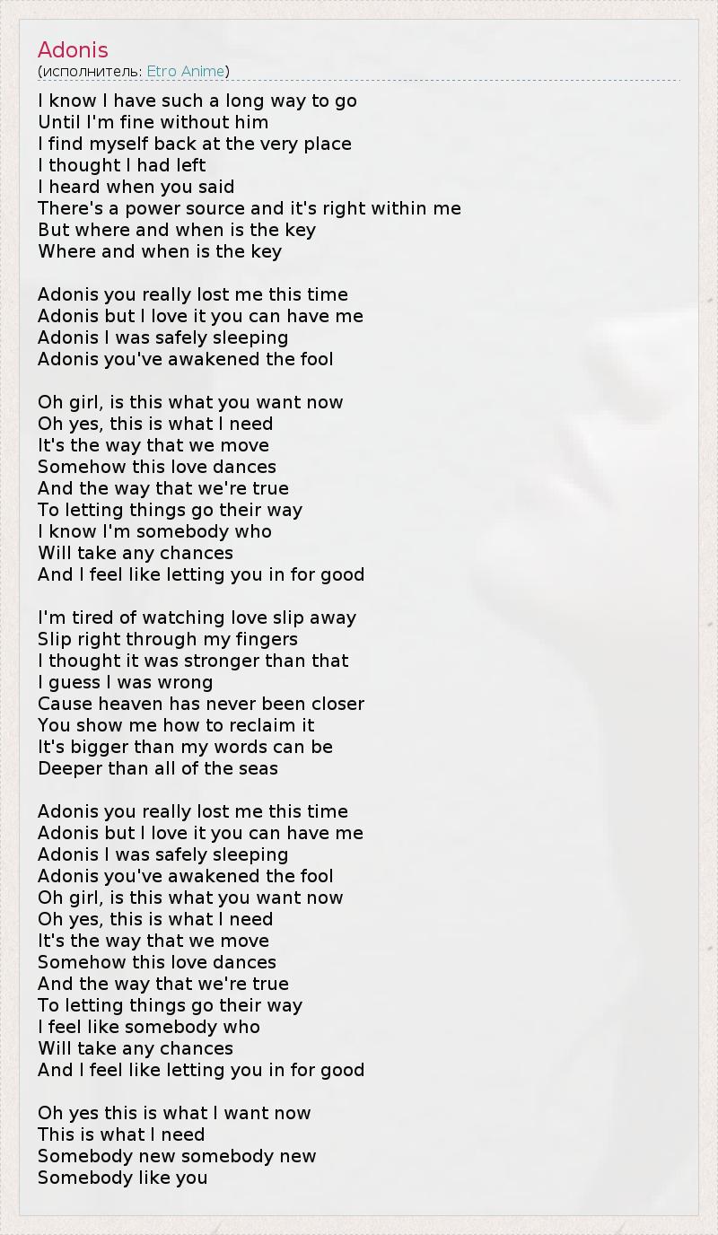 I know I have such a long way to go Until I'm fine without him I find myself back at the very place I thought I had left I heard when you said There's a power source and it's right within me But where and when is the key Where and when is the key Adonis you really lost me this time Adonis but I love it you can have me Adonis I was safely sleeping Adonis you've awakened the fool Oh girl, is this what you want now Oh yes, this is what I need It's the way that we move Somehow this love dances And the way that we're true To letting things go their way I know I'm somebody who Will take any chances And I feel like letting you in for good I'm tired of watching love slip away Slip right through my fingers I thought it was stronger than that I guess I was wrong Cause heaven has never been closer You show me how to reclaim it It's bigger than my words can be Deeper than all of the seas Adonis you really lost me this time Adonis but I love it you can have me Adonis I was safely sleeping Adonis you've awakened the fool Oh girl, is this what you want now Oh yes, this is what I need It's the way that we move Somehow this love dances And the way that we're true To letting things go their way I feel like somebody who Will take any chances And I feel like letting you in for good Oh yes this is what I want now This is what I need Somebody new somebody new Somebody like you