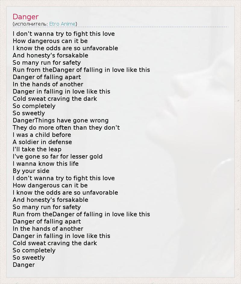 I don't wanna try to fight this love How dangerous can it be I know the odds are so unfavorable And honesty's forsakable So many run for safety Run from theDanger of falling in love like this Danger of falling apart In the hands of another Danger in falling in love like this Cold sweat craving the dark So completely So sweetly DangerThings have gone wrong They do more often than they don't I was a child before A soldier in defense I'll take the leap I've gone so far for lesser gold I wanna know this life By your side I don't wanna try to fight this love How dangerous can it be I know the odds are so unfavorable And honesty's forsakable So many run for safety Run from theDanger of falling in love like this Danger of falling apart In the hands of another Danger in falling in love like this Cold sweat craving the dark So completely So sweetly Danger