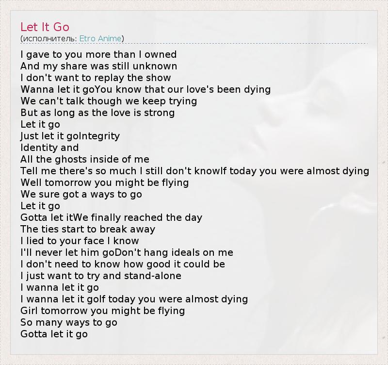 I gave to you more than I owned And my share was still unknown I don't want to replay the show Wanna let it goYou know that our love's been dying We can't talk though we keep trying But as long as the love is strong Let it go Just let it goIntegrity Identity and All the ghosts inside of me Tell me there's so much I still don't knowIf today you were almost dying Well tomorrow you might be flying We sure got a ways to go Let it go Gotta let itWe finally reached the day The ties start to break away I lied to your face I know I'll never let him goDon't hang ideals on me I don't need to know how good it could be I just want to try and stand-alone I wanna let it go I wanna let it goIf today you were almost dying Girl tomorrow you might be flying So many ways to go Gotta let it go