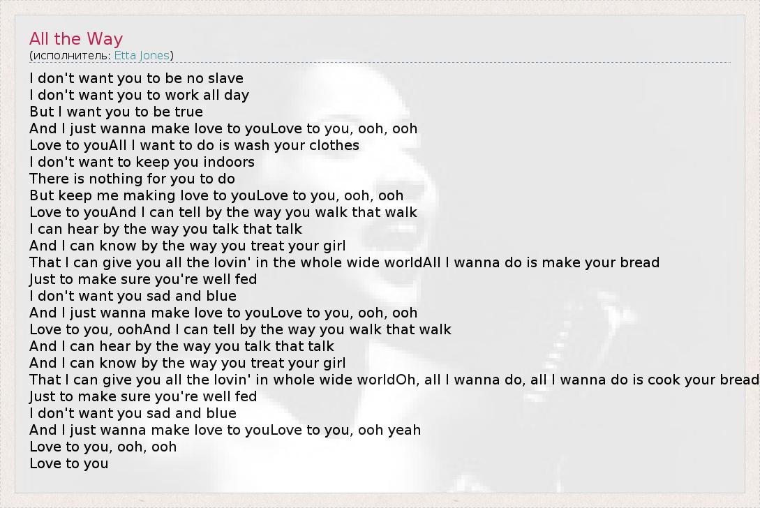 I don't want you to be no slave I don't want you to work all day But I want you to be true And I just wanna make love to youLove to you, ooh, ooh Love to youAll I want to do is wash your clothes I don't want to keep you indoors There is nothing for you to do But keep me making love to youLove to you, ooh, ooh Love to youAnd I can tell by the way you walk that walk I can hear by the way you talk that talk And I can know by the way you treat your girl That I can give you all the lovin' in the whole wide worldAll I wanna do is make your bread Just to make sure you're well fed I don't want you sad and blue And I just wanna make love to youLove to you, ooh, ooh Love to you, oohAnd I can tell by the way you walk that walk And I can hear by the way you talk that talk And I can know by the way you treat your girl That I can give you all the lovin' in whole wide worldOh, all I wanna do, all I wanna do is cook your bread Just to make sure you're well fed I don't want you sad and blue And I just wanna make love to youLove to you, ooh yeah Love to you, ooh, ooh Love to you