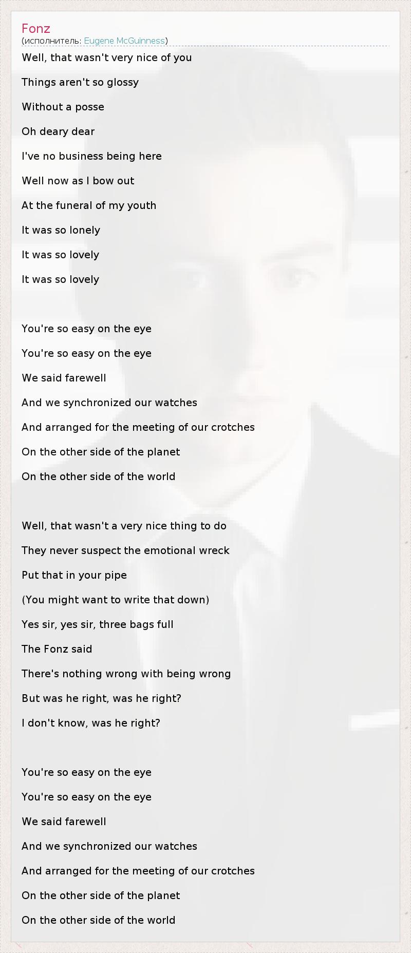 Well, that wasn't very nice of you Things aren't so glossy Without a posse Oh deary dear I've no business being here Well now as I bow out At the funeral of my youth It was so lonely It was so lovely It was so lovely You're so easy on the eye You're so easy on the eye We said farewell And we synchronized our watches And arranged for the meeting of our crotches On the other side of the planet On the other side of the world Well, that wasn't a very nice thing to do They never suspect the emotional wreck Put that in your pipe (You might want to write that down) Yes sir, yes sir, three bags full The Fonz said There's nothing wrong with being wrong But was he right, was he right? I don't know, was he right? You're so easy on the eye You're so easy on the eye We said farewell And we synchronized our watches And arranged for the meeting of our crotches On the other side of the planet On the other side of the world