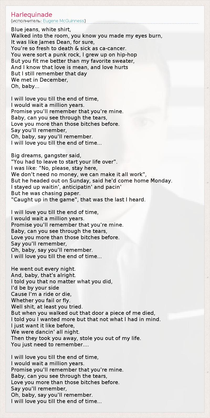 Blue jeans, white shirt, Walked into the room, you know you made my eyes burn, It was like James Dean, for sure, You're so fresh to death & sick as ca-cancer. You were sort a punk rock, I grew up on hip-hop But you fit me better than my favorite sweater, And I know that love is mean, and love hurts But I still remember that day We met in December, Oh, baby... I will love you till the end of time, I would wait a million years. Promise you'll remember that you're mine. Baby, can you see through the tears, Love you more than those bitches before. Say you'll remember, Оh, baby, say you'll remember. I will love you till the end of time... Big dreams, gangster said, "You had to leave to start your life over". I was like: "No, please, stay here, We don't need no money, we can make it all work", But he headed out on Sunday, said he'd come home Monday. I stayed up waitin', anticipatin' and pacin' But he was chasing paper. "Caught up in the game", that was the last I heard. I will love you till the end of time, I would wait a million years. Promise you'll remember that you're mine. Baby, can you see through the tears, Love you more than those bitches before. Say you'll remember, Oh, baby, say you'll remember. I will love you till the end of time... He went out every night. And, baby, that's alright. I told you that no matter what you did, I'd be by your side Cause I'm a ride or die, Whether you fail or fly. Well shit, at least you tried. But when you walked out that door a piece of me died, I told you I wanted more but that not what I had in mind. I just want it like before, We were dancin' all night. Then they took you away, stole you out of my life. You just need to remember.... I will love you till the end of time, I would wait a million years. Promise you'll remember that you're mine. Baby, can you see through the tears, Love you more than those bitches before. Say you'll remember, Oh, baby, say you'll remember. I will love you till the end of time...
