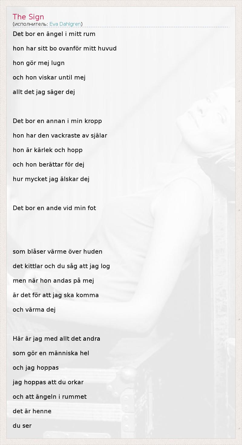 Det bor en ängel i mitt rum hon har sitt bo ovanför mitt huvud hon gör mej lugn och hon viskar until mej allt det jag säger dej Det bor en annan i min kropp hon har den vackraste av själar hon är kärlek och hopp och hon berättar för dej hur mycket jag älskar dej Det bor en ande vid min fot som blåser värme över huden det kittlar och du såg att jag log men när hon andas på mej är det för att jag ska komma och värma dej Här är jag med allt det andra som gör en människa hel och jag hoppas jag hoppas att du orkar och att ängeln i rummet det är henne du ser