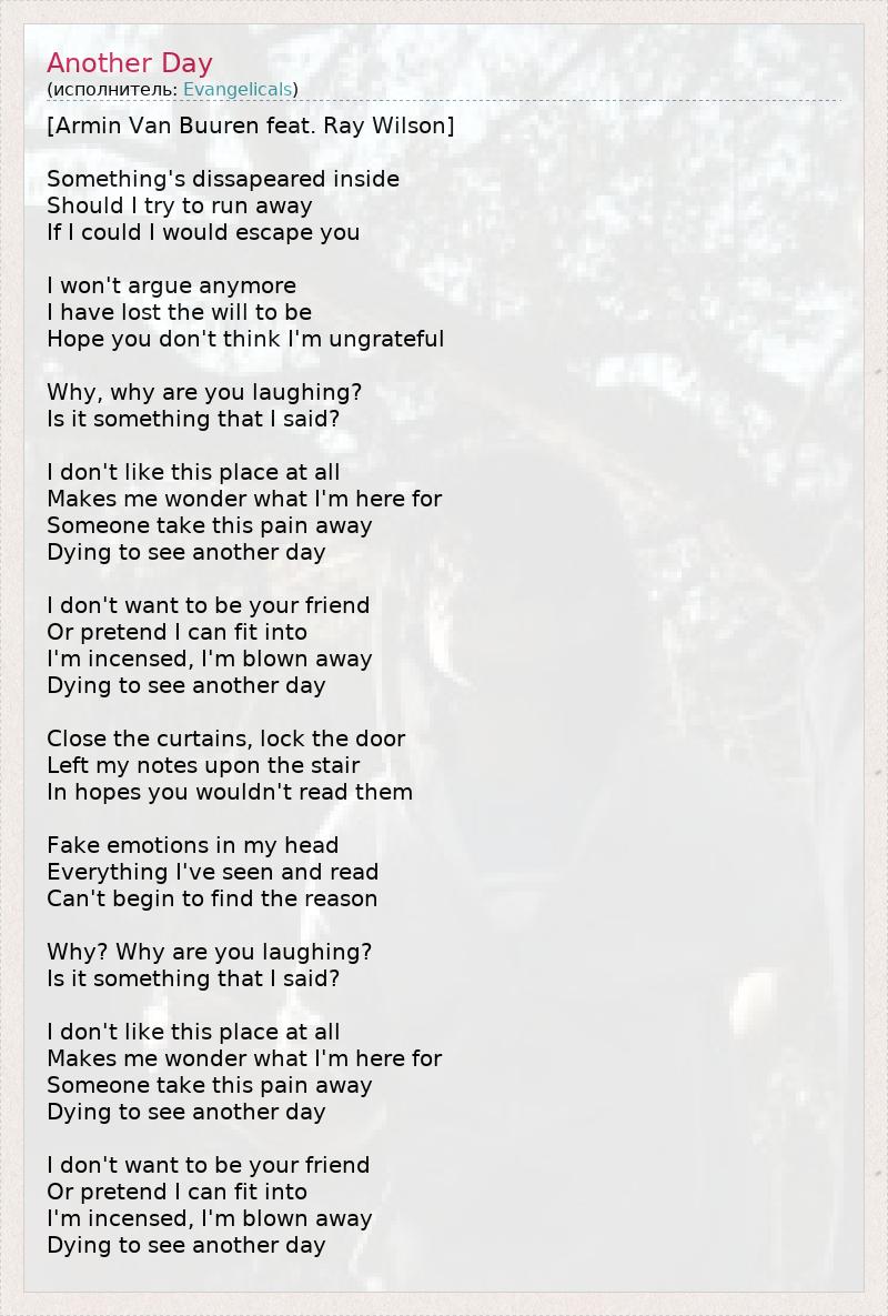 [Armin Van Buuren feat. Ray Wilson] Something's dissapeared inside Should I try to run away If I could I would escape you I won't argue anymore I have lost the will to be Hope you don't think I'm ungrateful Why, why are you laughing? Is it something that I said? I don't like this place at all Makes me wonder what I'm here for Someone take this pain away Dying to see another day I don't want to be your friend Or pretend I can fit into I'm incensed, I'm blown away Dying to see another day Close the curtains, lock the door Left my notes upon the stair In hopes you wouldn't read them Fake emotions in my head Everything I've seen and read Can't begin to find the reason Why? Why are you laughing? Is it something that I said? I don't like this place at all Makes me wonder what I'm here for Someone take this pain away Dying to see another day I don't want to be your friend Or pretend I can fit into I'm incensed, I'm blown away Dying to see another day