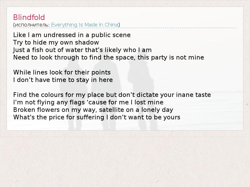 Как я разделся на публичной сцене, Постарайся скрыть свою тень. Просто рыба, вытащенная из воды, которая, вероятно... Кто я? Нужно посмотреть, чтобы найти место, эта партия не моя. Хотя линии выглядят как их точки, У меня нет времени, чтобы оставаться здесь. Найди цвета на мое место, но не диктуй свой глупый вкус, Я не летаю на каких-то флагах, ведь для меня я потерял себя. Сломанные цветы на моем пути, спутник на одиноком дне, Что стоит за страдания, я не хочу быть твоим...