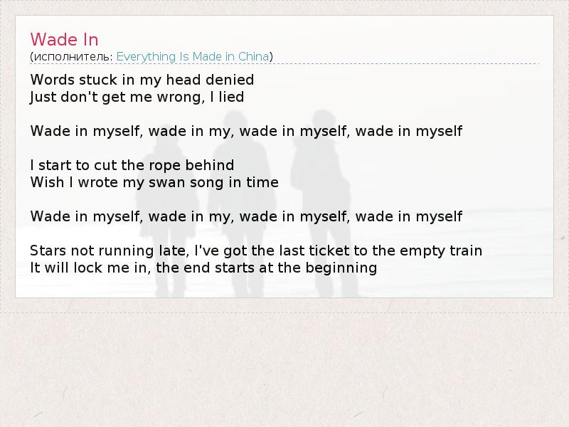 Words stuck in my head denied Just don't get me wrong, I lied Wade in myself, wade in my, wade in myself, wade in myself I start to cut the rope behind Wish I wrote my swan song in time Wade in myself, wade in my, wade in myself, wade in myself Stars not running late, I've got the last ticket to the empty train It will lock me in, the end starts at the beginning