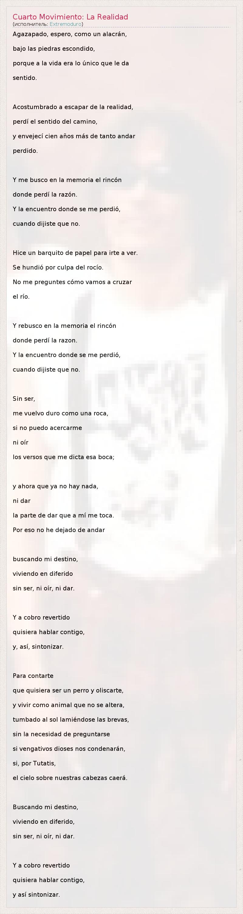 Это интересно:Extremoduro - испанская рок-группа из Пласенсии, Эстремадура. Лидера группы - Роберто Иньесту (Roberto Iniesta), также известного как "Robe", часто называют "El rey de Extremadura" - "Король Эстремадуры". Группа была создана в 1987-м году и считается одной из самых влиятельных команд в испанской хард-рок сцене, кроме того, она является настоящим символом своего региона. Лирику Роберто Иньесты часто... продолжение