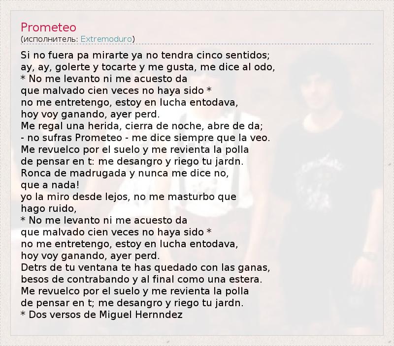 Si no fuera pa mirarte ya no tendra cinco sentidos; ay, ay, golerte y tocarte y me gusta, me dice al odo, * No me levanto ni me acuesto da que malvado cien veces no haya sido * no me entretengo, estoy en lucha entodava, hoy voy ganando, ayer perd. Me regal una herida, cierra de noche, abre de da; - no sufras Prometeo - me dice siempre que la veo. Me revuelco por el suelo y me revienta la polla de pensar en t: me desangro y riego tu jardn. Ronca de madrugada y nunca me dice no, que a nada! yo la miro desde lejos, no me masturbo que hago ruido, * No me levanto ni me acuesto da que malvado cien veces no haya sido * no me entretengo, estoy en lucha entodava, hoy voy ganando, ayer perd. Detrs de tu ventana te has quedado con las ganas, besos de contrabando y al final como una estera. Me revuelco por el suelo y me revienta la polla de pensar en t; me desangro y riego tu jardn. * Dos versos de Miguel Hernndez