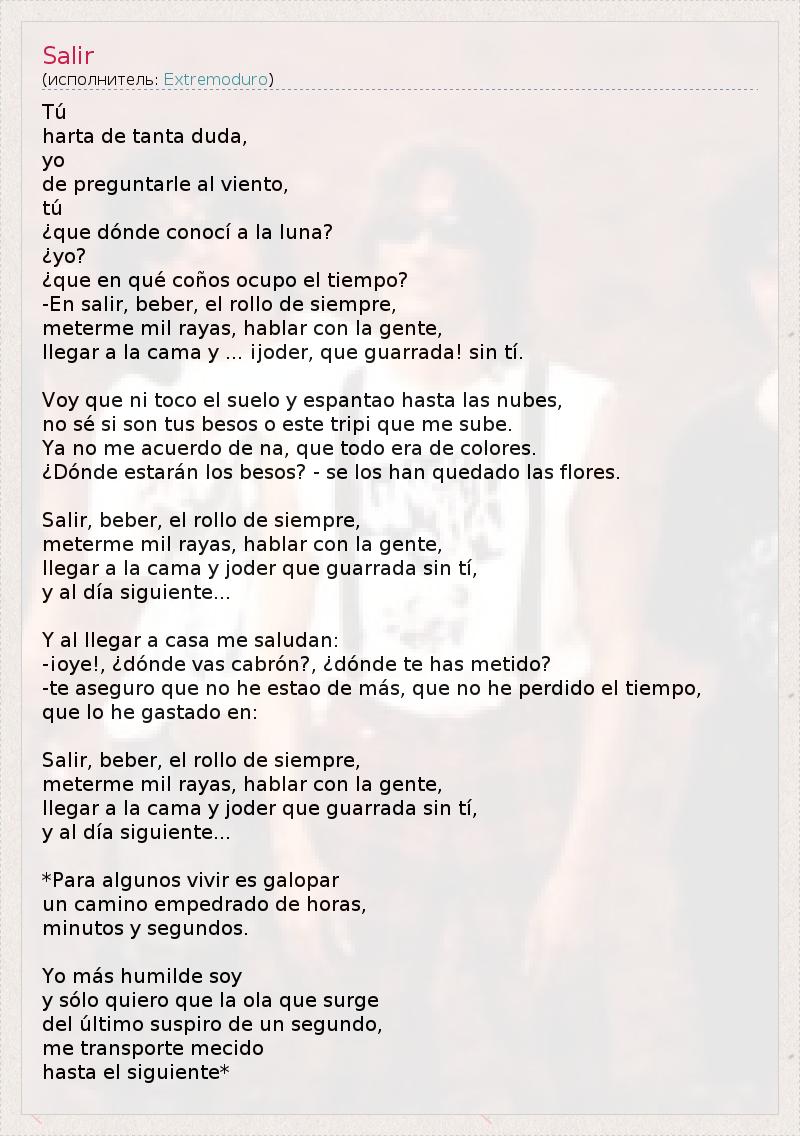 Tú Harta де Танта дуда , лет де preguntarle др. Viento , tú ¿ Que Dónde conocíLa Luna? ¿ Лет ? ¿ Que ан qué coños ocupo El Tiempo ? - En Salir , Beber , эль ролло де Siempre , meterme млн. Rayas , Hablar кон ла Gente , llegar а-ля Кама у ... ¡ Joder , дие guarrada ! грех Ti . Вой дие Ni ТОСО эль Suelo у espantao хаста Las Nubes , нет sé си сын ЕП Besos о Эсте Tripi дие мне Sube . Не Я. не мне Acuerdo де па, дие списка задач эпохи де Colores . ¿ Dónde estarán лос Besos ? - Себе лос хан quedado Las Flores . Salir , Beber , эль ролло де Siempre , meterme млн. Rayas , Hablar кон ла Gente , llegar а-ля Кама у Joder дие guarrada грех Ti , у аль día siguiente ... У аль llegarCasa меня saludan : - ? ¡ Ое , ¿ Dónde VAS Cabron , ¿ Dónde те имеет metido ? -тэ aseguro дие не он estao де más , дие не он PERDIDO El Tiempo , дие вот он gastado ан : Salir , Beber , эль ролло де Siempre , meterme млн. Rayas , Hablar кон ла Gente , llegar а-ля Кама у Joder дие guarrada грех Ti , у аль día siguiente ... * Пункт algunos Vivir эс galopar ООН Камино Empedrado де Horas , Minutos у Segundos . Йо más humilde соевый у Sólo Quiero дие ла Ола дие всплеск дель último Suspiro де ООН Сегундо , мне Transporte mecido хаста эль siguiente *