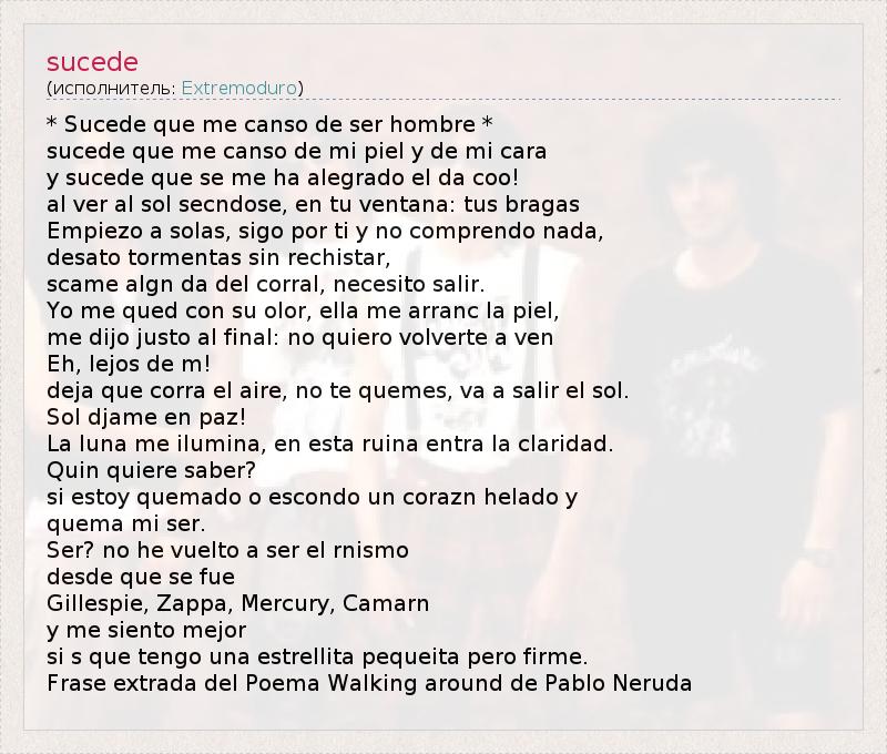 * Sucede que me canso de ser hombre * sucede que me canso de mi piel y de mi cara y sucede que se me ha alegrado el da coo! al ver al sol secndose, en tu ventana: tus bragas Empiezo a solas, sigo por ti y no comprendo nada, desato tormentas sin rechistar, scame algn da del corral, necesito salir. Yo me qued con su olor, ella me arranc la piel, me dijo justo al final: no quiero volverte a ven Eh, lejos de m! deja que corra el aire, no te quemes, va a salir el sol. Sol djame en paz! La luna me ilumina, en esta ruina entra la claridad. Quin quiere saber? si estoy quemado o escondo un corazn helado y quema mi ser. Ser? no he vuelto a ser el rnismo desde que se fue Gillespie, Zappa, Mercury, Camarn y me siento mejor si s que tengo una estrellita pequeita pero firme. Frase extrada del Poema Walking around de Pablo Neruda