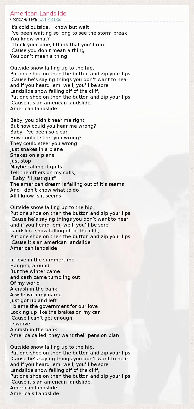 It's cold outside, I know but wait I've been waiting so long to see the storm break You know what? I think your blue, I think that you'll run 'Cause you don't mean a thing You don't mean a thing Outside snow falling up to the hip, Put one shoe on then the button and zip your lips 'Cause he's saying things you don't want to hear and if you heard 'em, well, you'll be sore Landslide snow falling off of the cliff, Put one shoe on then the button and zip your lips 'Cause it's an american landslide, American landslide Baby, you didn't hear me right But how could you hear me wrong? Baby, I've been so clear, How could I steer you wrong? They could steer you wrong Just snakes in a plane Snakes on a plane Just stop Maybe calling it quits Tell the others on my calls, "Baby I'll just quit" The american dream is falling out of it's seams And I don't know what to do All I know is it seems Outside snow falling up to the hip, Put one shoe on then the button and zip your lips 'Cause he's saying things you don't want to hear and if you heard 'em, well, you'll be sore Landslide snow falling off of the cliff, Put one shoe on then the button and zip your lips 'Cause it's an american landslide, American landslide In love in the summertime Hanging around But the winter came and cash came tumbling out Of my world A crash in the bank A wife with my name Just got up and left I blame the government for our love Locking up like the brakes on my car 'Cause I can't get enough I swerve A crash in the bank America called, they want their pension plan Outside snow falling up to the hip, Put one shoe on then the button and zip your lips 'Cause he's saying things you don't want to hear and if you heard 'em, well, you'll be sore Landslide snow falling off of the cliff, Put one shoe on then the button and zip your lips 'Cause it's an american landslide, American landslide America's Landslide