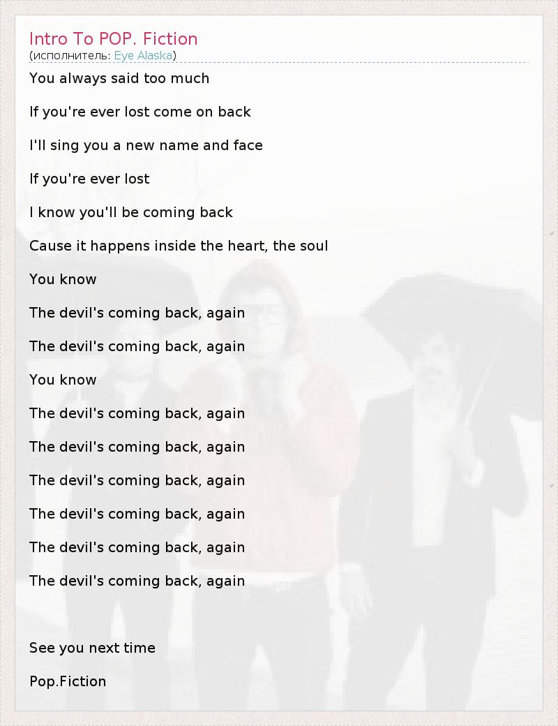 You always said too much If you're ever lost come on back I'll sing you a new name and face If you're ever lost I know you'll be coming back Cause it happens inside the heart, the soul You know The devil's coming back, again The devil's coming back, again You know The devil's coming back, again The devil's coming back, again The devil's coming back, again The devil's coming back, again The devil's coming back, again The devil's coming back, again See you next time Pop.Fiction