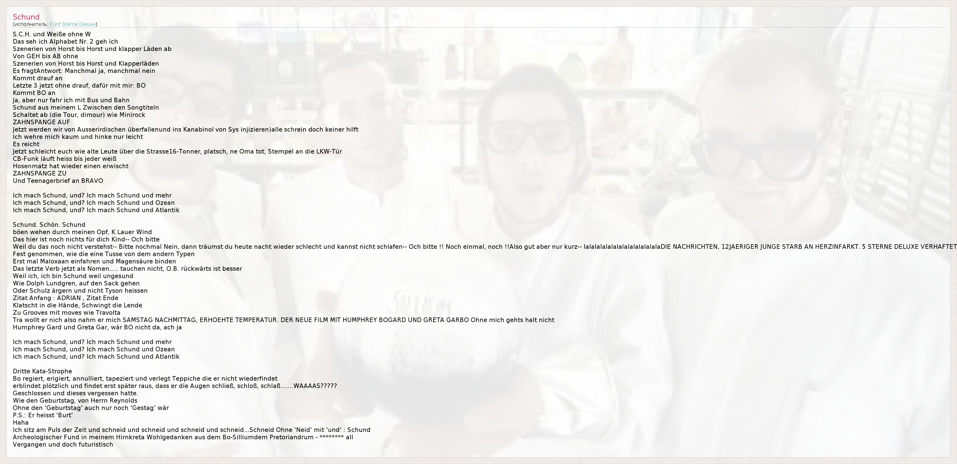 S.C.H. und Weiße ohne W Das seh ich Alphabet Nr. 2 geh ich Szenerien von Horst bis Horst und klapper Läden ab Von GEH bis AB ohne Szenerien von Horst bis Horst und Klapperläden Es fragtAntwort: Manchmal ja, manchmal nein Kommt drauf an Letzte 3 jetzt ohne drauf, dafür mit mir: BO Kommt BO an Ja, aber nur fahr ich mit Bus und Bahn Schund aus meinem L Zwischen den Songtiteln Schaltet ab (die Tour, dimour) wie Minirock ZAHNSPANGE AUF Jetzt werden wir von Ausserirdischen überfallenund ins Kanabinol von Sys injizieren)alle schrein doch keiner hilft Ich wehre mich kaum und hinke nur leicht Es reicht Jetzt schleicht euch wie alte Leute über die Strasse16-Tonner, platsch, ne Oma tot, Stempel an die LKW-Tür CB-Funk läuft heiss bis jeder weiß Hosenmatz hat wieder einen erwischt ZAHNSPANGE ZU Und Teenagerbrief an BRAVO Ich mach Schund, und? Ich mach Schund und mehr Ich mach Schund, und? Ich mach Schund und Ozean Ich mach Schund, und? Ich mach Schund und Atlantik Schund. Schön. Schund böen wehen durch meinen Opf, K Lauer Wind Das hier ist noch nichts für dich Kind-- Och bitte Weil du das noch nicht verstehst-- Bitte nochmal Nein, dann träumst du heute nacht wieder schlecht und kannst nicht schlafen-- Och bitte !! Noch einmal, noch !!Also gut aber nur kurz-- lalalalalalalalalalalalalalaDIE NACHRICHTEN, 12JAERIGER JUNGE STARB AN HERZINFARKT. 5 STERNE DELUXE VERHAFTET Fest genommen, wie die eine Tusse von dem andern Typen Erst mal Maloxaan einfahren und Magensäure binden Das letzte Verb jetzt als Nomen..... tauchen nicht, O.B. rückwärts ist besser Weil ich, ich bin Schund weil ungesund Wie Dolph Lundgren, auf den Sack gehen Oder Schulz ärgern und nicht Tyson heissen Zitat Anfang : ADRIAN , Zitat Ende Klatscht in die Hände, Schwingt die Lende Zu Grooves mit moves wie Travolta Tra wollt er nich also nahm er mich SAMSTAG NACHMITTAG, ERHOEHTE TEMPERATUR. DER NEUE FILM MIT HUMPHREY BOGARD UND GRETA GARBO Ohne mich gehts halt nicht Humphrey Gard und Greta Gar, wär BO nicht da, ach ja Ich mach Schund, und? Ich mach Schund und mehr Ich mach Schund, und? Ich mach Schund und Ozean Ich mach Schund, und? Ich mach Schund und Atlantik Dritte Kata-Strophe Bo regiert, erigiert, annulliert, tapeziert und verlegt Teppiche die er nicht wiederfindet erblindet plötzlich und findet erst später raus, dass er die Augen schließ, schloß, schlaß.......WAAAAS????? Geschlossen und dieses vergessen hatte. Wie den Geburtstag, von Herrn Reynolds Ohne den 'Geburtstag' auch nur noch 'Gestag' wär P.S.: Er heisst 'Burt' Haha Ich sitz am Puls der Zeit und schneid und schneid und schneid und schneid...Schneid Ohne 'Neid' mit 'und' : Schund Archeologischer Fund in meinem Hirnkreta Wohlgedanken aus dem Bo-Silliumdem Pretoriandrum - ******** all Vergangen und doch futuristisch