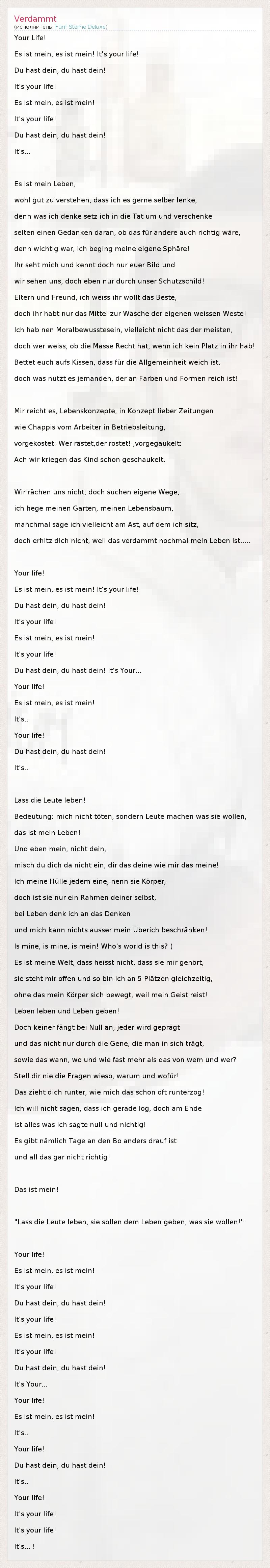 Your Life! Es ist mein, es ist mein! It's your life! Du hast dein, du hast dein! It's your life! Es ist mein, es ist mein! It's your life! Du hast dein, du hast dein! It's... Es ist mein Leben, wohl gut zu verstehen, dass ich es gerne selber lenke, denn was ich denke setz ich in die Tat um und verschenke selten einen Gedanken daran, ob das für andere auch richtig wäre, denn wichtig war, ich beging meine eigene Sphäre! Ihr seht mich und kennt doch nur euer Bild und wir sehen uns, doch eben nur durch unser Schutzschild! Eltern und Freund, ich weiss ihr wollt das Beste, doch ihr habt nur das Mittel zur Wäsche der eigenen weissen Weste! Ich hab nen Moralbewusstesein, vielleicht nicht das der meisten, doch wer weiss, ob die Masse Recht hat, wenn ich kein Platz in ihr hab! Bettet euch aufs Kissen, dass für die Allgemeinheit weich ist, doch was nützt es jemanden, der an Farben und Formen reich ist! Mir reicht es, Lebenskonzepte, in Konzept lieber Zeitungen wie Chappis vom Arbeiter in Betriebsleitung, vorgekostet: Wer rastet,der rostet! ,vorgegaukelt: Ach wir kriegen das Kind schon geschaukelt. Wir rächen uns nicht, doch suchen eigene Wege, ich hege meinen Garten, meinen Lebensbaum, manchmal säge ich vielleicht am Ast, auf dem ich sitz, doch erhitz dich nicht, weil das verdammt nochmal mein Leben ist..... Your life! Es ist mein, es ist mein! It's your life! Du hast dein, du hast dein! It's your life! Es ist mein, es ist mein! It's your life! Du hast dein, du hast dein! It's Your... Your life! Es ist mein, es ist mein! It's.. Your life! Du hast dein, du hast dein! It's.. Lass die Leute leben! Bedeutung: mich nicht töten, sondern Leute machen was sie wollen, das ist mein Leben! Und eben mein, nicht dein, misch du dich da nicht ein, dir das deine wie mir das meine! Ich meine Hülle jedem eine, nenn sie Körper, doch ist sie nur ein Rahmen deiner selbst, bei Leben denk ich an das Denken und mich kann nichts ausser mein Überich beschränken! Is mine, is mine, is mein! Who's world is this? ( Es ist meine Welt, dass heisst nicht, dass sie mir gehört, sie steht mir offen und so bin ich an 5 Plätzen gleichzeitig, ohne das mein Körper sich bewegt, weil mein Geist reist! Leben leben und Leben geben! Doch keiner fängt bei Null an, jeder wird geprägt und das nicht nur durch die Gene, die man in sich trägt, sowie das wann, wo und wie fast mehr als das von wem und wer? Stell dir nie die Fragen wieso, warum und wofür! Das zieht dich runter, wie mich das schon oft runterzog! Ich will nicht sagen, dass ich gerade log, doch am Ende ist alles was ich sagte null und nichtig! Es gibt nämlich Tage an den Bo anders drauf ist und all das gar nicht richtig! Das ist mein! "Lass die Leute leben, sie sollen dem Leben geben, was sie wollen!" Your life! Es ist mein, es ist mein! It's your life! Du hast dein, du hast dein! It's your life! Es ist mein, es ist mein! It's your life! Du hast dein, du hast dein! It's Your... Your life! Es ist mein, es ist mein! It's.. Your life! Du hast dein, du hast dein! It's.. Your life! It's your life! It's your life! It's... !