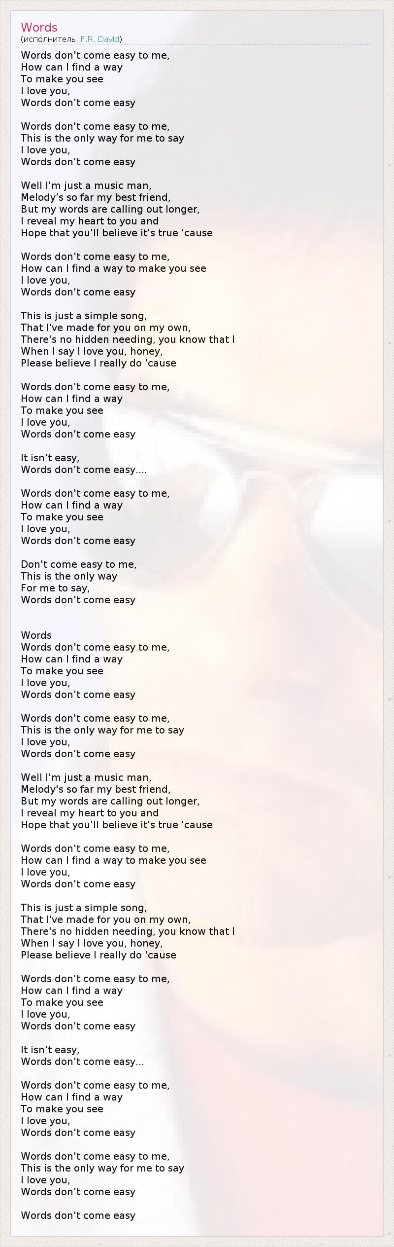 Words don't come easy to me, How can I find a way To make you see I love you, Words don't come easy Words don't come easy to me, This is the only way for me to say I love you, Words don't come easy Well I'm just a music man, Melody’s so far my best friend, But my words are calling out longer, I reveal my heart to you and Hope that you'll believe it's true 'cause Words don't come easy to me, How can I find a way to make you see I love you, Words don't come easy This is just a simple song, That I've made for you on my own, There's no hidden needing, you know that I When I say I love you, honey, Please believe I really do 'cause Words don't come easy to me, How can I find a way To make you see I love you, Words don't come easy It isn't easy, Words don't come easy.... Words don't come easy to me, How can I find a way To make you see I love you, Words don't come easy Don't come easy to me, This is the only way For me to say, Words don't come easy Words Words don't come easy to me, How can I find a way To make you see I love you, Words don't come easy Words don't come easy to me, This is the only way for me to say I love you, Words don't come easy Well I'm just a music man, Melody's so far my best friend, But my words are calling out longer, I reveal my heart to you and Hope that you'll believe it's true 'cause Words don't come easy to me, How can I find a way to make you see I love you, Words don't come easy This is just a simple song, That I've made for you on my own, There's no hidden needing, you know that I When I say I love you, honey, Please believe I really do 'cause Words don't come easy to me, How can I find a way To make you see I love you, Words don't come easy It isn't easy, Words don't come easy... Words don't come easy to me, How can I find a way To make you see I love you, Words don't come easy Words don't come easy to me, This is the only way for me to say I love you, Words don't come easy Words don't come easy