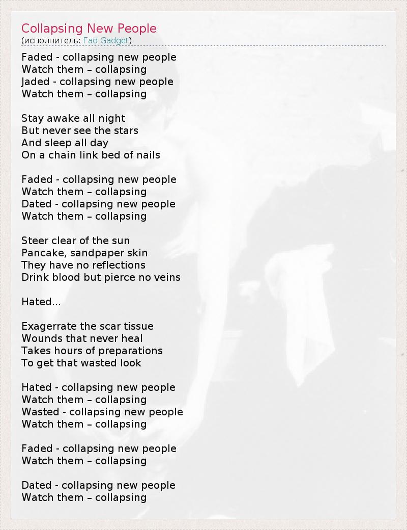 Faded - collapsing new people Watch them – collapsing Jaded - collapsing new people Watch them – collapsing Stay awake all night But never see the stars And sleep all day On a chain link bed of nails Faded - collapsing new people Watch them – collapsing Dated - collapsing new people Watch them – collapsing Steer clear of the sun Pancake, sandpaper skin They have no reflections Drink blood but pierce no veins Hated... Exagerrate the scar tissue Wounds that never heal Takes hours of preparations To get that wasted look Hated - collapsing new people Watch them – collapsing Wasted - collapsing new people Watch them – collapsing Faded - collapsing new people Watch them – collapsing Dated - collapsing new people Watch them – collapsing