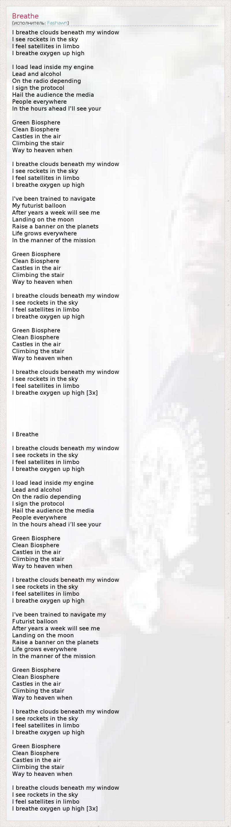 Вдохну — облако растает, Смотрю — шаттлы ввысь летят, Вверху спутник проплывает, Дышу полной грудью я. Всё готово к испытаньям, Залит этанол. И согласно указаньям Подписан протокол. Салютуют мне повсюду, Я машу в ответ. Скоро я увижу чудо: Зелени цвет, Жизни расцвет. Замок парит, Дух мой летит Прямо в небо, где... Вдохну — облако растает, Смотрю — шаттлы ввысь летят, Вверху спутник проплывает, Дышу полной грудью я. Я в своей мечте настойчив: В небеса стремлюсь. Обучение закончив, Мягко прилунюсь. На планетах засияет Жизни яркий свет, Наконец-то я увижу Зелени цвет, Жизни расцвет. Замок парит, Дух мой летит Прямо в небо, где... Вдохну — облако растает, Смотрю — шаттлы ввысь летят, Вверху спутник проплывает, Дышу полной грудью я. Зелени цвет, Жизни расцвет. Замок парит, Дух мой летит Прямо в небо, где... Вдохну — облако растает, Смотрю — шаттлы ввысь летят, Вверху спутник проплывает, Дышу полной грудью я. [3x] * поэтический (эквиритмический) перевод с элементами творческой интерпретации Я дышу (перевод) Я «дышу» небесами, сидя у окна. Я вижу ракеты в небе. Я чувствую, как где-то там парят спутники. Я глубоко вдыхаю кислород. Я загружаю свою машину оловом, Оловом и алкоголем. Положившись на радио, Я подписываю договор. Приветствую зрителей и журналистов, Людей повсюду, Теперь часами я буду видеть вас. Зеленая биосфера, Чистая биосфера. Замки в воздухе, Вверх по ступенькам По пути к небесам, когда… Я «дышу» небесами, сидя у окна. Я вижу ракеты в небе. Я чувствую, как где-то там парят спутники. Я глубоко вдыхаю кислород. Я научился управлять Своим воздушным шаром будущего. Спустя годы вы увидите, как Я приземлюсь на поверхности Луны. Поднимите приветственные плакаты на вашей планете – Жизнь есть везде! Ведь так было задумано. Зеленая биосфера, Чистая биосфера. Замки в воздухе, Вверх по ступенькам По пути к небесам, когда… Я «дышу» небесами, сидя у окна. Я вижу ракеты в небе. Я чувствую, как где-то там парят спутники. Я глубоко вдыхаю кислород. Зеленая биосфера, Чистая биосфера. Замки в воздухе, Вверх по ступенькам По пути к небесам, когда… Я «дышу» небесами, сидя у окна. Я вижу ракеты в небе. Я чувствую, как где-то там парят спутники. Я глубоко вдыхаю кислород. [3x]