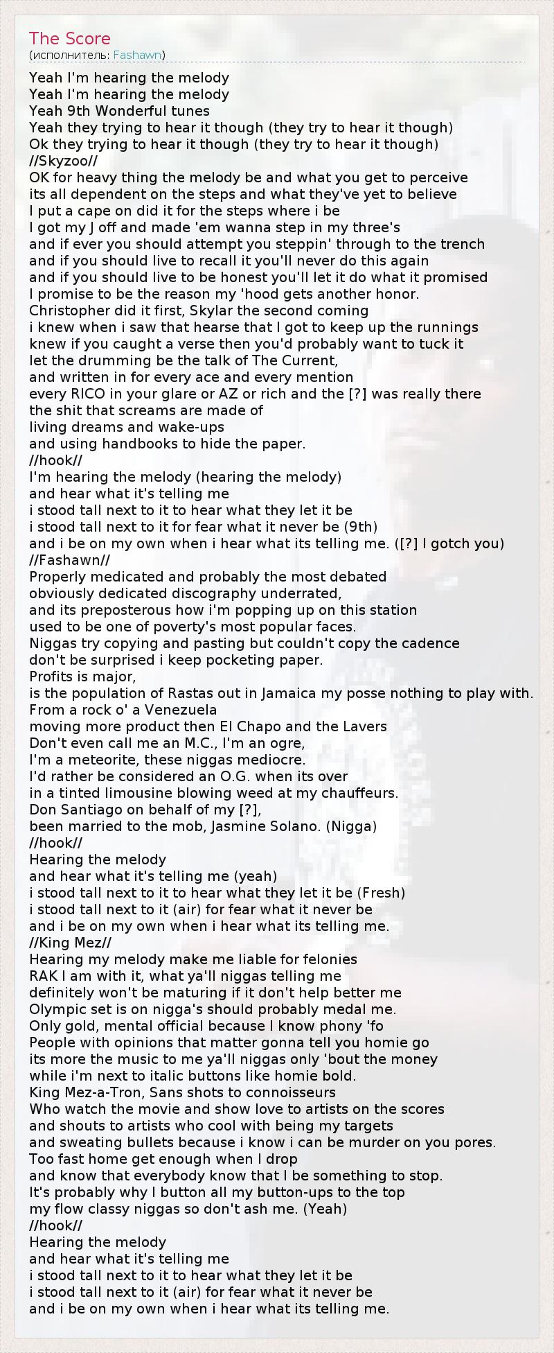 Yeah I'm hearing the melody Yeah I'm hearing the melody Yeah 9th Wonderful tunes Yeah they trying to hear it though (they try to hear it though) Ok they trying to hear it though (they try to hear it though) //Skyzoo// OK for heavy thing the melody be and what you get to perceive its all dependent on the steps and what they've yet to believe I put a cape on did it for the steps where i be I got my J off and made 'em wanna step in my three's and if ever you should attempt you steppin' through to the trench and if you should live to recall it you'll never do this again and if you should live to be honest you'll let it do what it promised I promise to be the reason my 'hood gets another honor. Christopher did it first, Skylar the second coming i knew when i saw that hearse that I got to keep up the runnings knew if you caught a verse then you'd probably want to tuck it let the drumming be the talk of The Current, and written in for every ace and every mention every RICO in your glare or AZ or rich and the [?] was really there the shit that screams are made of living dreams and wake-ups and using handbooks to hide the paper. //hook// I'm hearing the melody (hearing the melody) and hear what it's telling me i stood tall next to it to hear what they let it be i stood tall next to it for fear what it never be (9th) and i be on my own when i hear what its telling me. ([?] I gotch you) //Fashawn// Properly medicated and probably the most debated obviously dedicated discography underrated, and its preposterous how i'm popping up on this station used to be one of poverty's most popular faces. Niggas try copying and pasting but couldn't copy the cadence don't be surprised i keep pocketing paper. Profits is major, is the population of Rastas out in Jamaica my posse nothing to play with. From a rock o' a Venezuela moving more product then El Chapo and the Lavers Don't even call me an M.C., I'm an ogre, I'm a meteorite, these niggas mediocre. I'd rather be considered an O.G. when its over in a tinted limousine blowing weed at my chauffeurs. Don Santiago on behalf of my [?], been married to the mob, Jasmine Solano. (Nigga) //hook// Hearing the melody and hear what it's telling me (yeah) i stood tall next to it to hear what they let it be (Fresh) i stood tall next to it (air) for fear what it never be and i be on my own when i hear what its telling me. //King Mez// Hearing my melody make me liable for felonies RAK I am with it, what ya'll niggas telling me definitely won't be maturing if it don't help better me Olympic set is on nigga's should probably medal me. Only gold, mental official because I know phony 'fo People with opinions that matter gonna tell you homie go its more the music to me ya'll niggas only 'bout the money while i'm next to italic buttons like homie bold. King Mez-a-Tron, Sans shots to connoisseurs Who watch the movie and show love to artists on the scores and shouts to artists who cool with being my targets and sweating bullets because i know i can be murder on you pores. Too fast home get enough when I drop and know that everybody know that I be something to stop. It's probably why I button all my button-ups to the top my flow classy niggas so don't ash me. (Yeah) //hook// Hearing the melody and hear what it's telling me i stood tall next to it to hear what they let it be i stood tall next to it (air) for fear what it never be and i be on my own when i hear what its telling me.