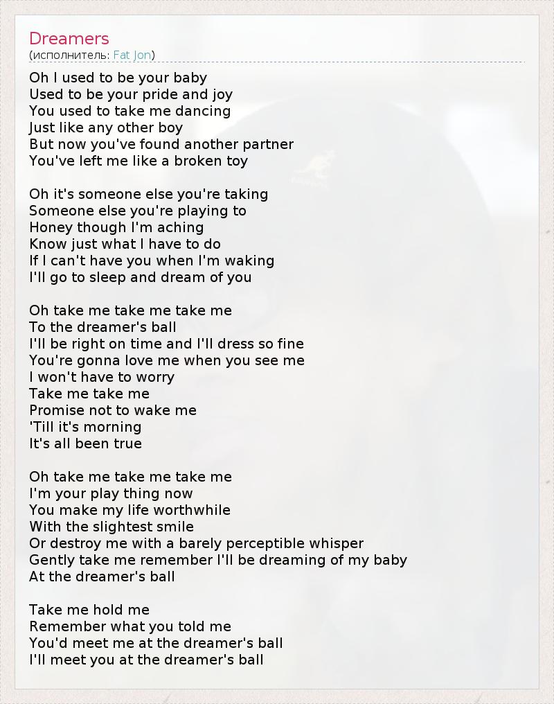 О, раньше я был твоим милым, Раньше я был твоей гордостью и радостью. Ты, бывало, уводила меня танцевать, Как и любого другого парня. Но теперь ты нашла себе иного партнера, И бросила меня, как сломанную игрушку. О, ты уже завладеваешь кем-то другим, С кем-то другим заигрываешь. Милая, хоть я чувствую боль, Я знаю, что я должен делать: Раз тебя нет рядом со мной, когда я просыпаюсь, Я пойду мечтать о тебе во сне. О, возьми меня, возьми меня На бал мечтателя. Я приду точно во время, одетый так нарядно, Ты влюбишься в меня с первого взгляда, Мне не придется в этом сомневаться. Возьми меня, возьми меня, Пообещай, что не станешь будить меня,- Пока не наступит утро, Это все происходит на самом деле. О, возьми меня, возьми меня, Я теперь игрушка в твоих руках. Ради одной твоей мимолетной улыбки Стоит жить, Но твой едва слышный шепот может убить меня. Нежно возьми меня, помни, я буду мечтать о моей малышке На балу мечтателя. Возьми меня, не отпускай, Вспомни что ты мне сказала: Ты встретишь меня на балу мечтателя. Я встречу тебя на балу мечтателя...